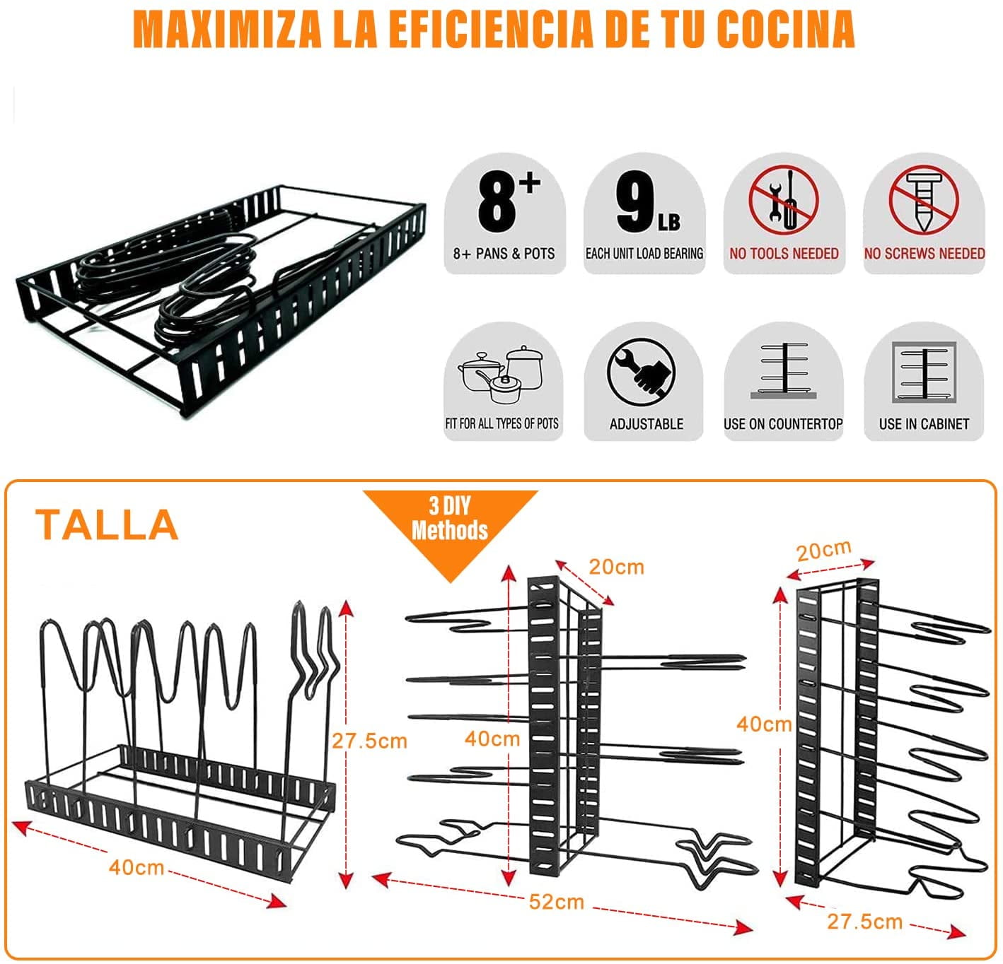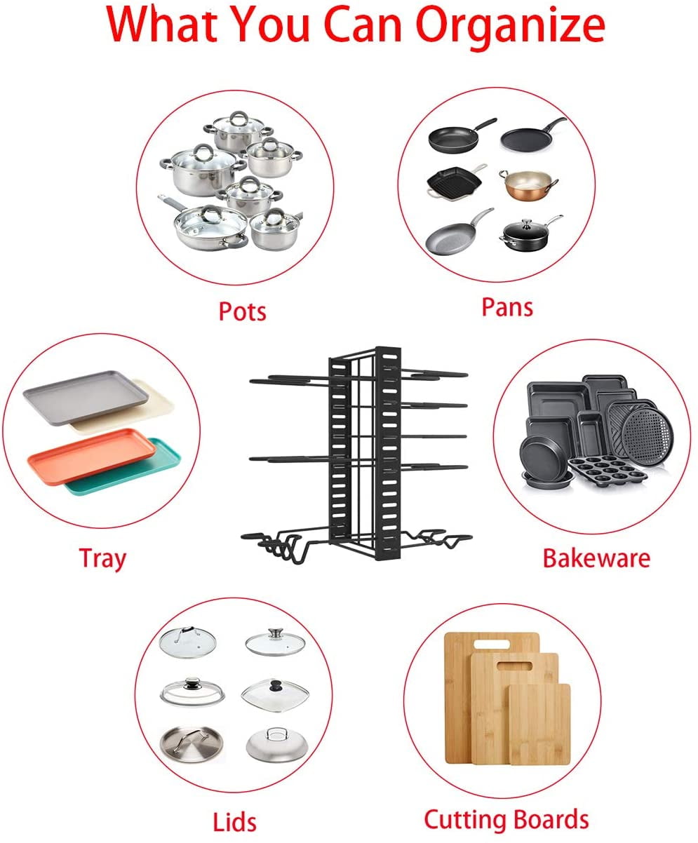 This Version pan rack organizer comes with 8 adjustable tiers, you can install the pan organizer according to the size of your pots and pans. No matter how big your pot is, it can still fit into your pot organizer. This kitchen rack has 3 DIY methods. You can install 8 tiers on both sides or just install 4 tiers on one side. You can place the pot rack in the way you like. Lay it down or make it standing is all up to you. A perfect kitchen counter organizer for kitchen organization and storage.