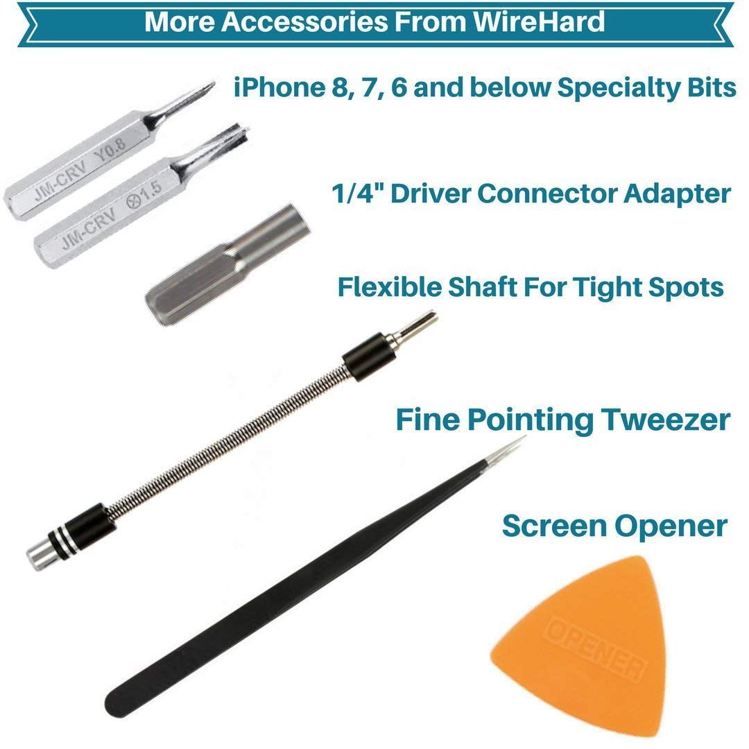 - ADDITIONAL ACCESSORIES – At WIREHARD, we decided to make a special treat to our customers by adding extra helpful pieces of accessories. We are including a flexible triangle screen opener, TRA fine pointing tweezer, Y0.8 and X1.5 iPhone specialty bits and a Connector adapter