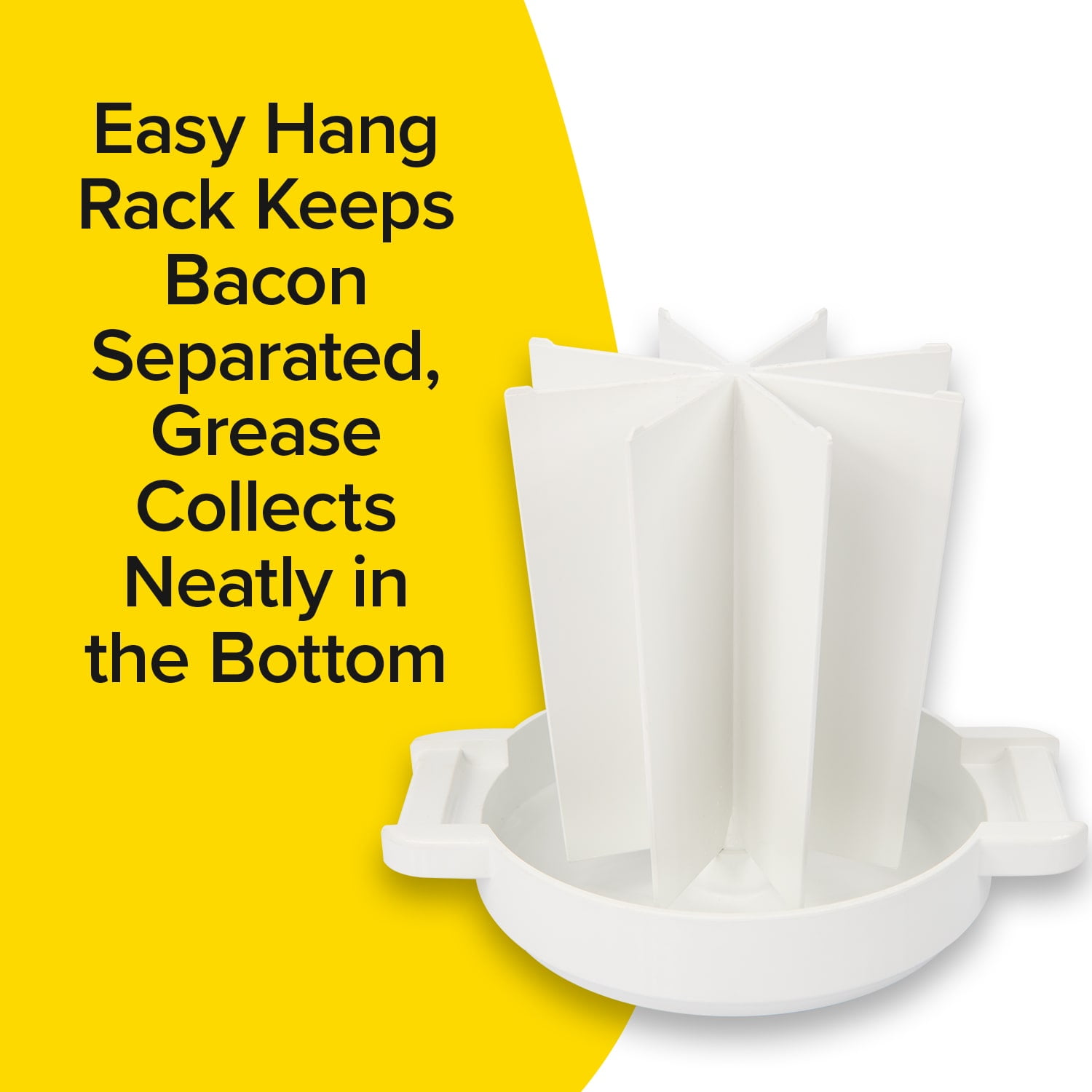 - Grease Collects at the Bottom: simply place your bacon strips over the vertical rack to keep your bacon separated and the grease collects neatly in the bottom.