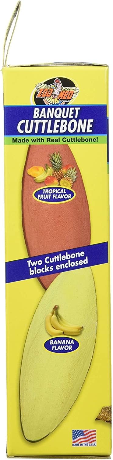 Zoo Med’s Banquet Cuttlebone Mineral Blocks are made with real Cuttlebone powder, making them an ideal mineral source for all pet birds. These blocks help condition birds’ beaks and serve as an excellent source of enrichment as they perform natural chewing behaviors. Comes with a Tropical Fruit and Banana Flavor.