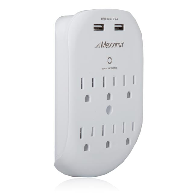 Maxxima 6 Outlet Dual USB 2.4A Grounded Adapter Plug, 490 Joules Surge Protection