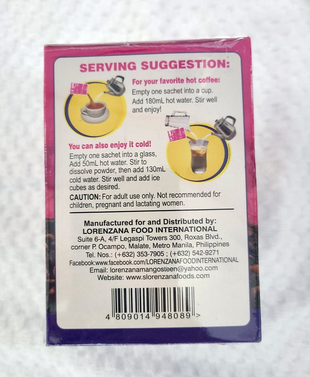 2x LORENZANA Mangosteen Guyabano COFFEE 2x 12 x 21g Sachets A product of: Lorenzana Philippine Brand International has been providing tasty products since 1928.