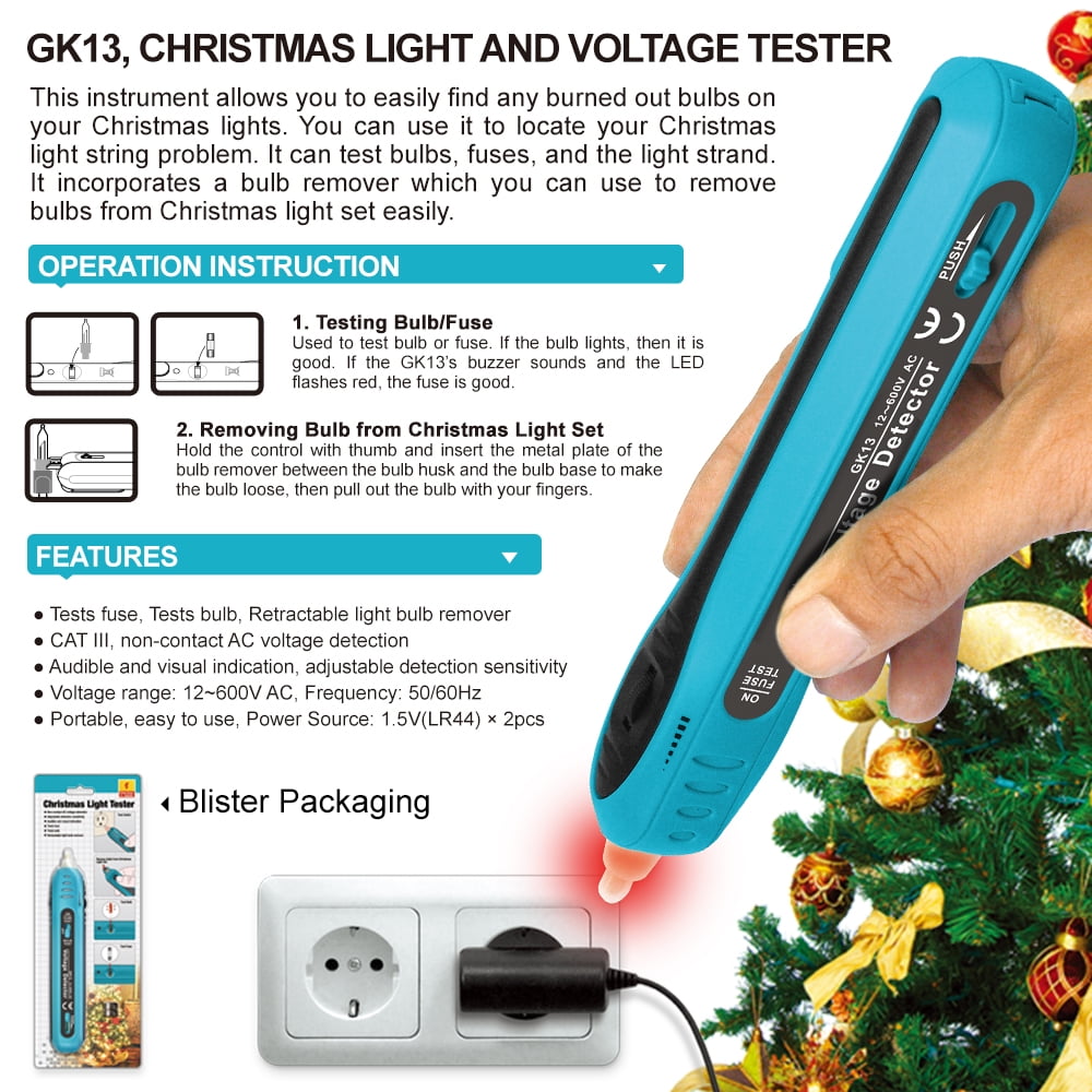 - 【NON-CONTACT AC VOLTAGE DETECTION】Christmas light tester tool is non-contact AC voltage detection, used as a 12V to 600V AC power tester, allows you to easily find any burned out bulbs on your Christmas lights. If you have any issues, check the batteries.
