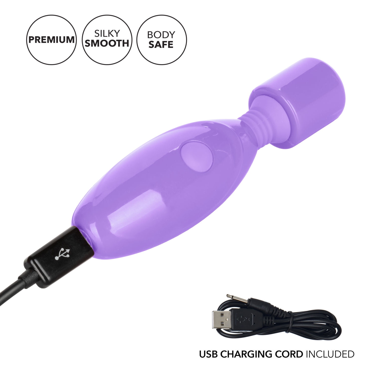 Perfectly petite mini-massager with 2 removable Silicone pleasure tips 3 powerful speeds of vibration Easy push-button control – hold for 3 seconds to turn on or off USB rechargeable – charging cord included Complete charge in 50 minutes Massager will run for 75 minutes on high speed and 160 minutes on low speedPhthalate Free, Water-Resistant, Rechargeable, Vibrates