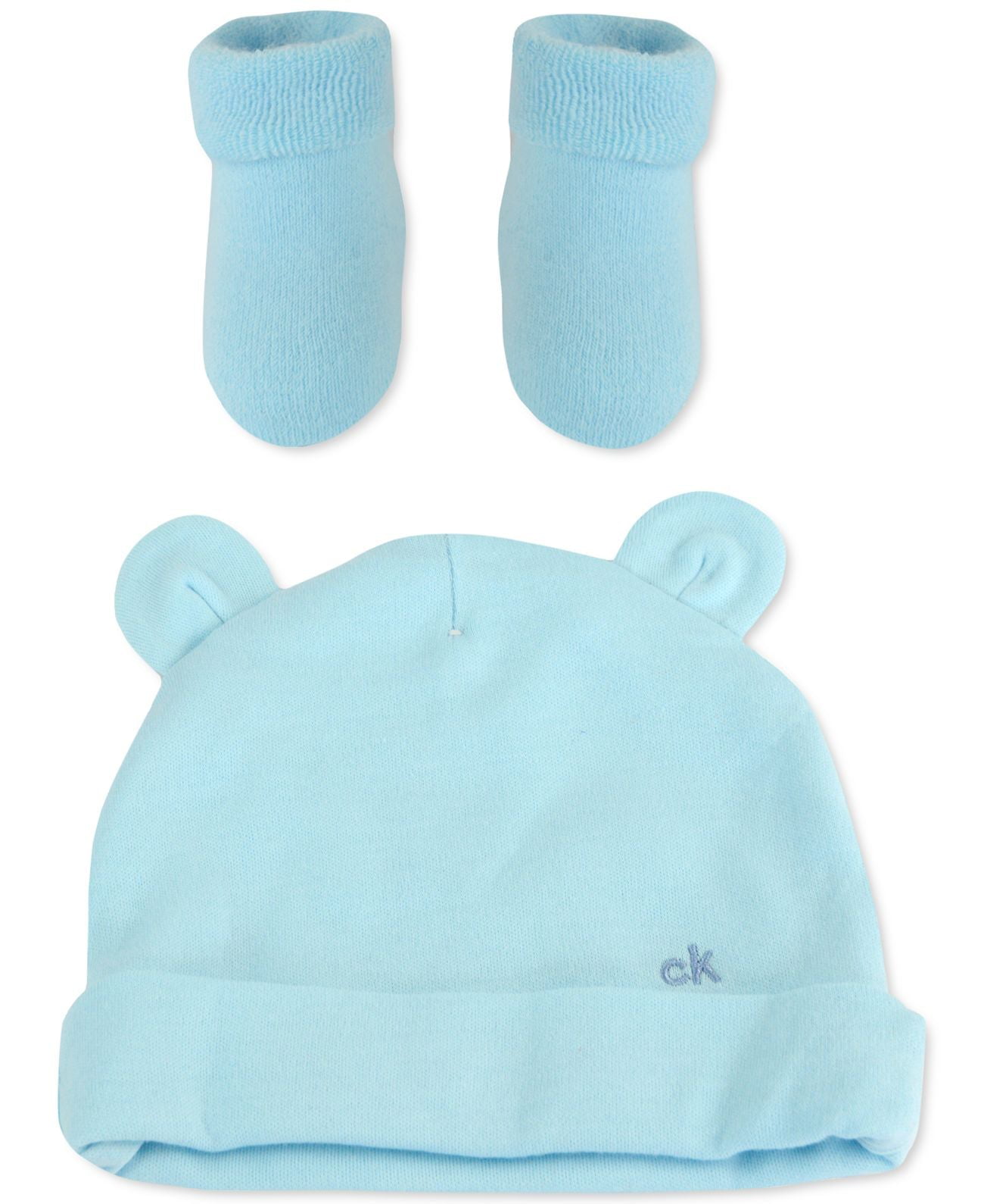 Keep baby bear warm (and adorable) from head to tiny toes with Calvin Klein’s matching ear hat and booties set