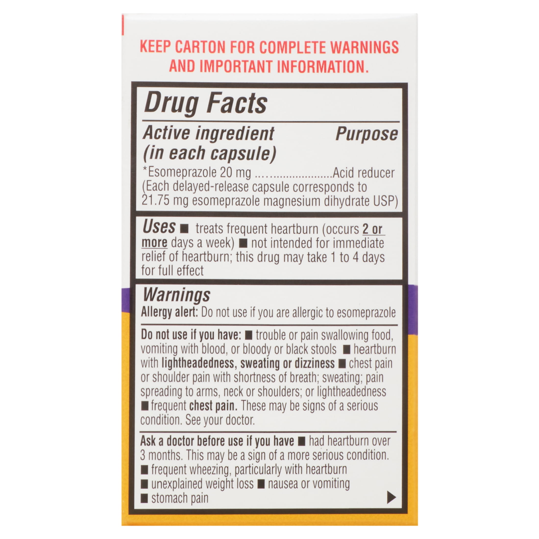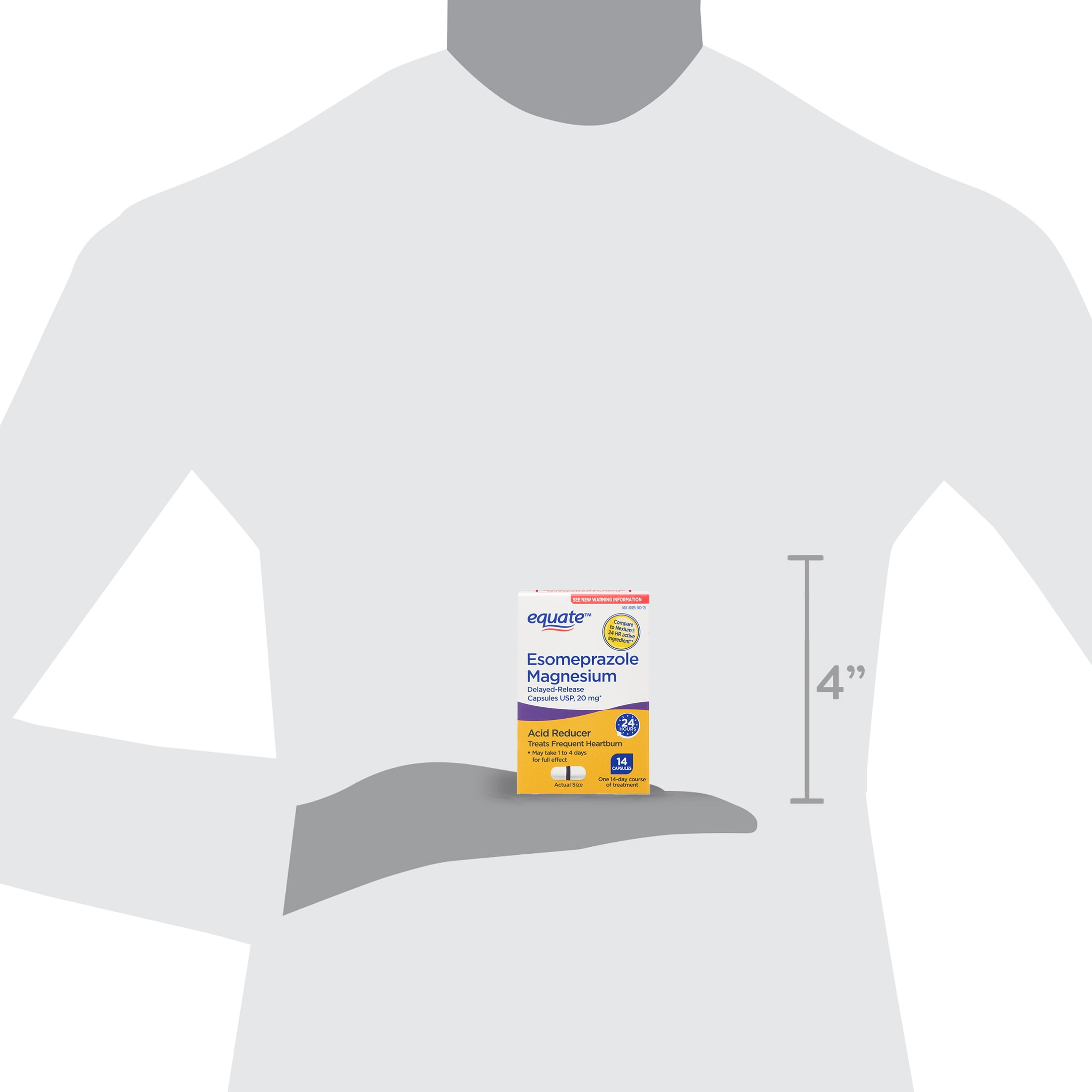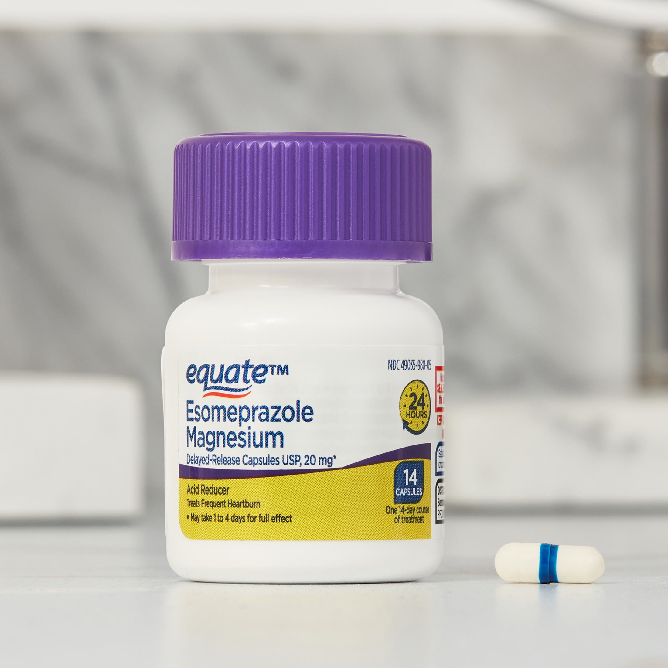 Equate Esomeprazole Magnesium Delayed-Release Capsules are essential when treating frequent heartburn. These caps have a delayed release and each is made up of 20mg. Each cap reduces acid and treats your frequent heartburn for up to 24 hours. Each pack contains a 14-day course to treat frequent heartburn. It may take one to four days to see the full effect of these capsules. These can be compared to Nexium 24 HR active ingredient. Help get your heartburn under control with the Equate Esomeprazole Magnesium Delayed-Release Capsules.