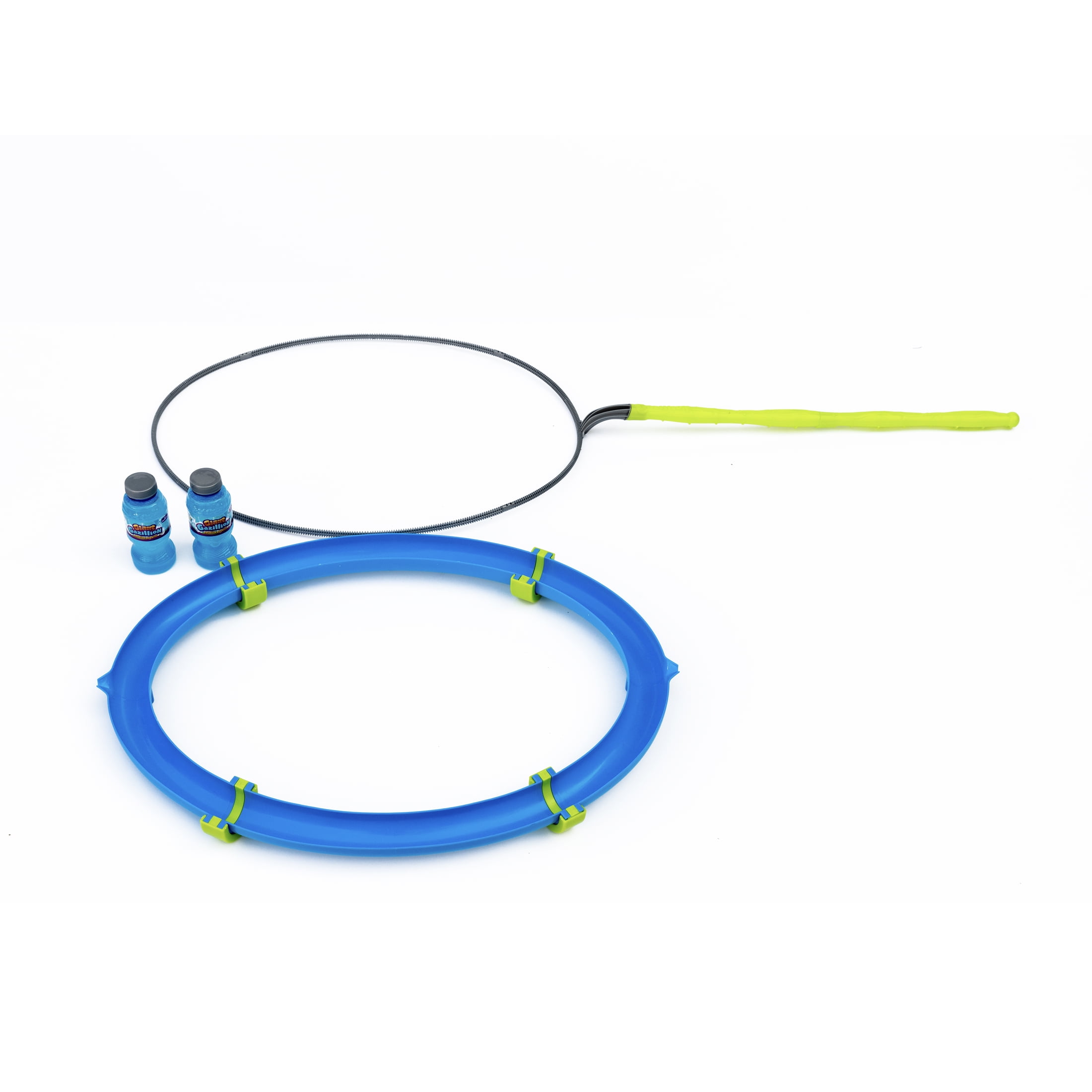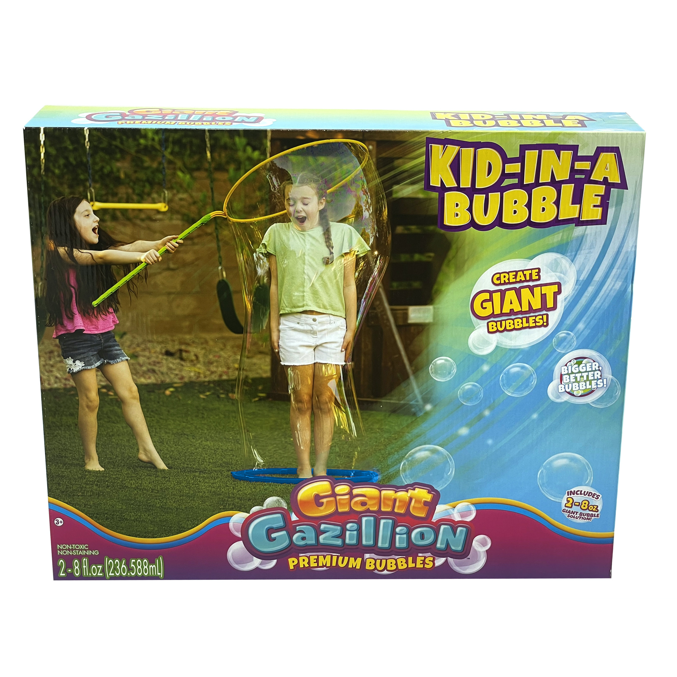- Includes two 8 ounce bottles of Gazillion Giant Bubble Solution. Gazillion Bubble Solution is eco-friendly, safe, non-toxic, and does not stain clothes or furniture.