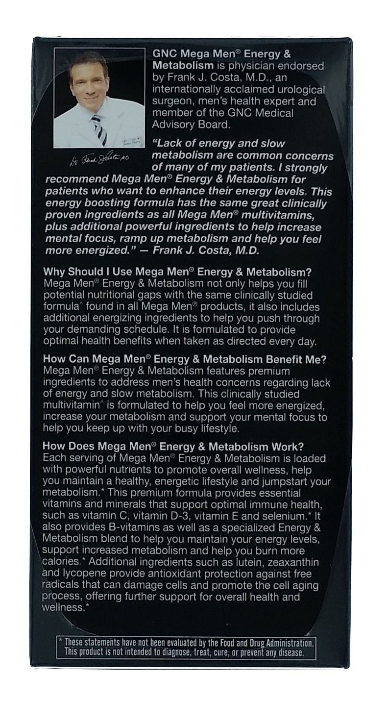 GNC Mega Men Energy & Metabolism Multivitamins – 180 ct… With 1,600 IU of Vitamin D-3 for colon health and immune support*. Boosts energy and metabolism*. Supports mental focus*. Timed-release caplets provide a gradual release of vital nutrients… *these statements have not been evaluated by the Food and Drug Administration. This product is not intended to diagnose, treat, cure, or prevent any disease. GNC MEGA MEN Energy and Metabolism keeps you on the right track for filling your nutritional gaps. Mega Men Energy Metabolism is an enhanced multivitamin that provides the same clinically studied base as our Mega Men formula with ingredients that help boost your energy. It supplies B-vitamins that are essential for energy production and metabolism. Contain a premium blend of antioxidants including selenium, vitamin C and vitamin E to aid in supporting the body’s immunity.