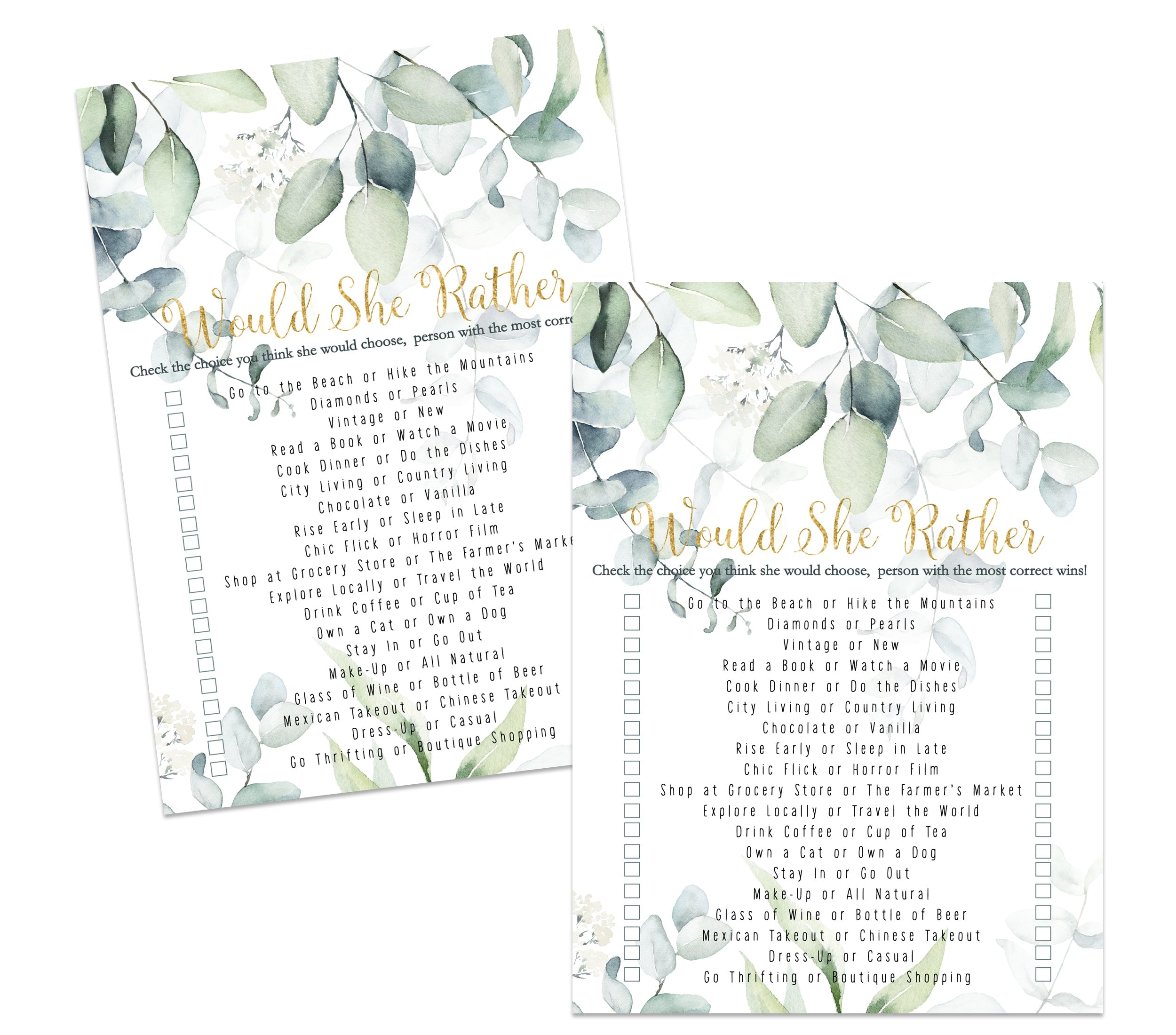 Gold and Greenery Would She Rather Game Pack of 25 Cards for Bridal Shower Rehearsal Birthday Bride Best Guessing Activity Tropical Floral Event Supply (5×7) Paper Clever Party