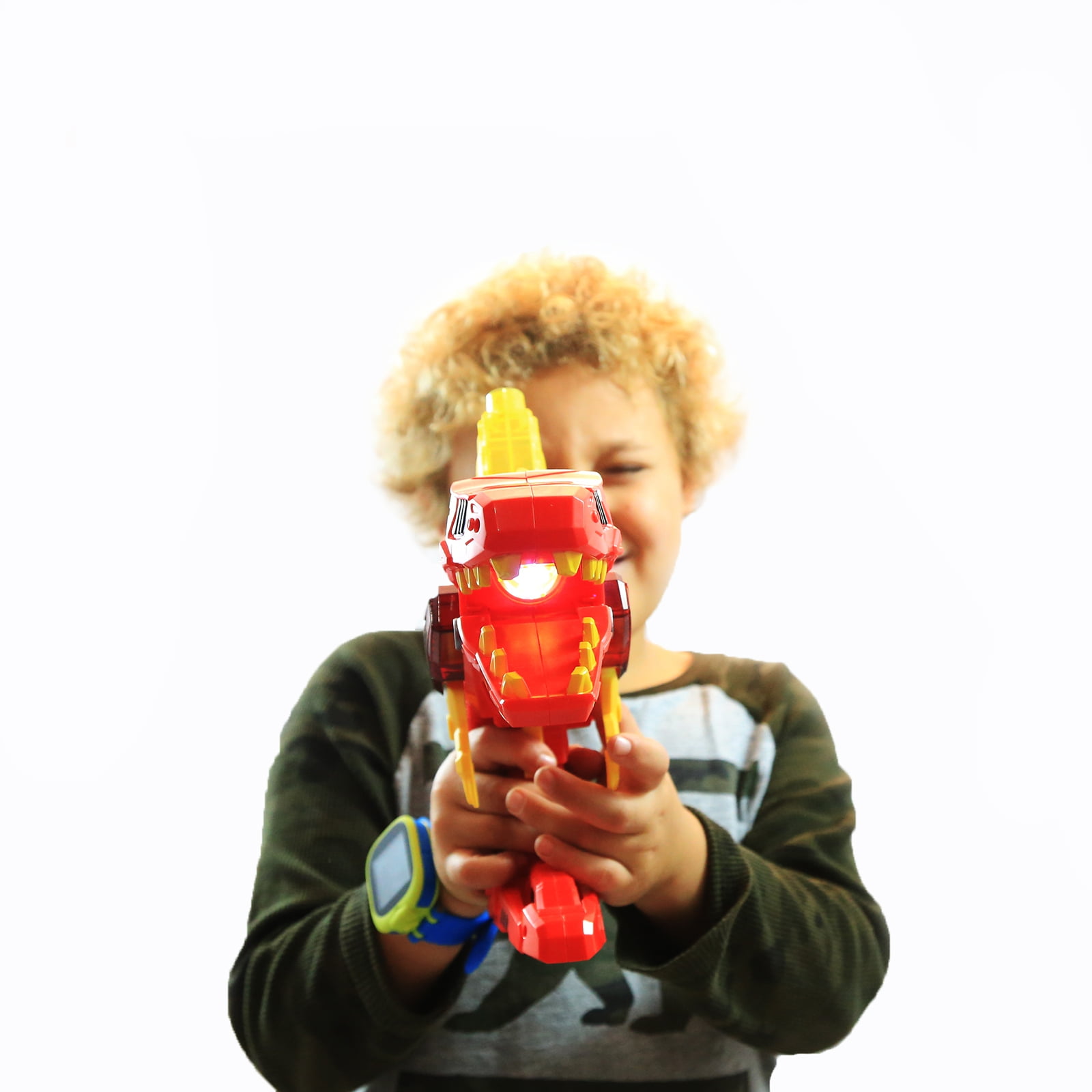 - TRANSFORMS WITH INTERCHANGABLE PARTS: Transforms into 3 Different Shapes. Great cool dinosaur gift for age 3 years old kids, boys and girls. With the simple press of the trigger, charge and watch the T-Rex’s jaw unhinge and light up along with the side panels as it charges up for epic battle. It even roars
