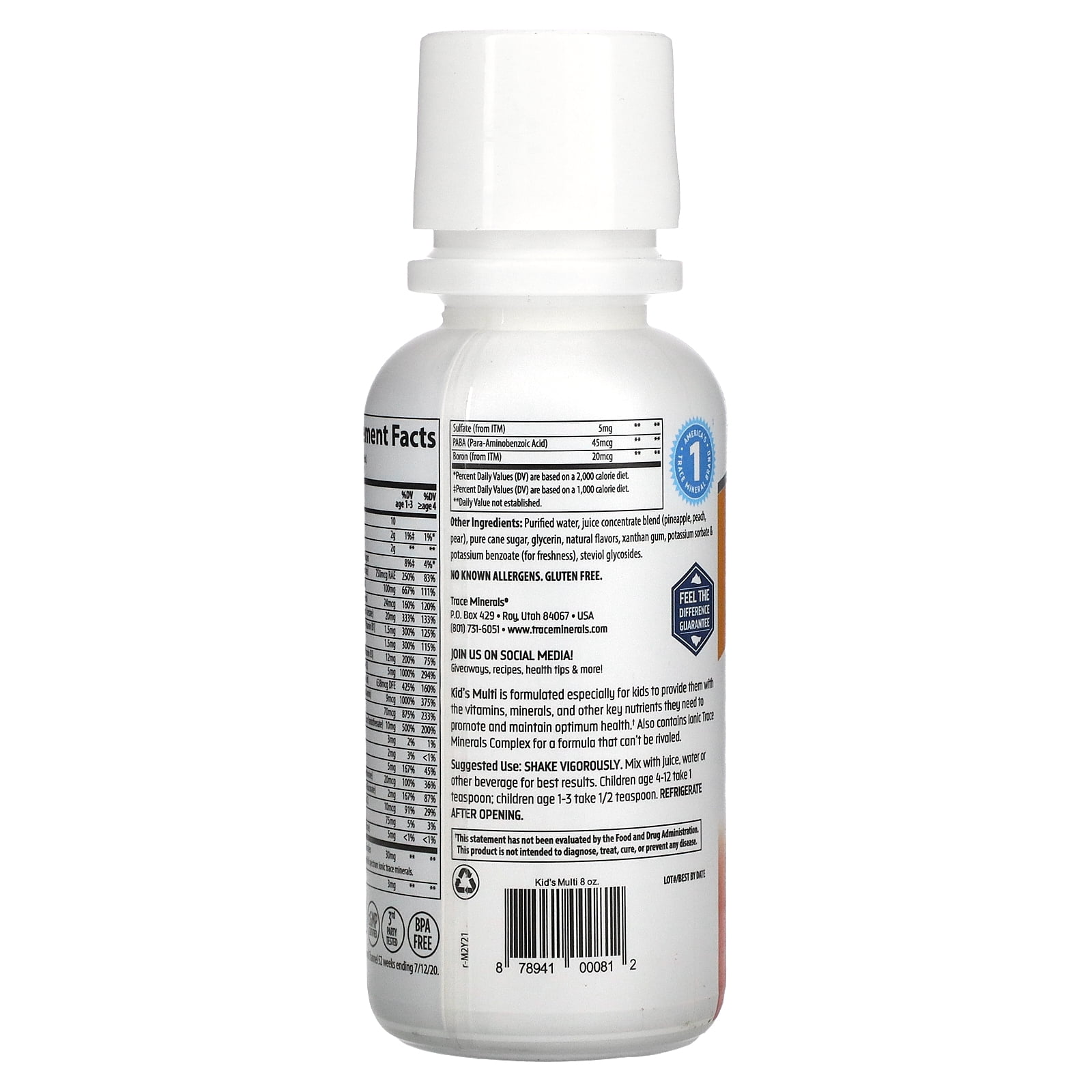 Are you tired of arguing with your kid’s every time they have to take their vitamins? Trace Minerals Kids Multi Multivitamin is a great solution to this age-old problem. Now you can make sure they are taking their vitamins without them even knowing!!Kid’s Multi Multivitamin is a nutritional supplement formulated specifically to provide your kid’s with the essential nutrients needed to encourage proper growth and development. Trace Minerals Kidâs Multi Multivitamin is a blend of essential vitamins, minerals and other vital nutrients combined with the power of ConcenTrace®. ConcenTrace® is a proprietary blend of over 72 trace minerals, that also vital to growth and development, plus they help to increase absorption and assimilation of the nutrients contained in their multivitamin.Scientists have discovered that the raw foods we eat today have substantially low amounts of vitamins and minerals as compared to 30 years ago. Because of over-farming, our soils have become depleted of the minerals that were once abundant. With raw foods, like fruits and vegetables, not containing the essential nutrients your body needs to perform, taking a mineral supplement is one of the smartest choices you can make for yourself and your family.Another reason Trace Minerals Kidâs Multi Multivitamin is a great solution to filling your nutritional goals is that is comes in a liquid. Liquimins is the latest line of products from Trace Minerals, designed to help everyone get the nutrients they need without having to take pills. Liquimins is an ionic charged liquid surging with over 72 minerals and trace elements that your body needs to achieve optimal health. Another great benefit to Liquimins is they are absorbed quickly because they’re liquid.Look for the Liquimins drop on the label and feel the difference a full spectrum of ionically charged minerals can make.