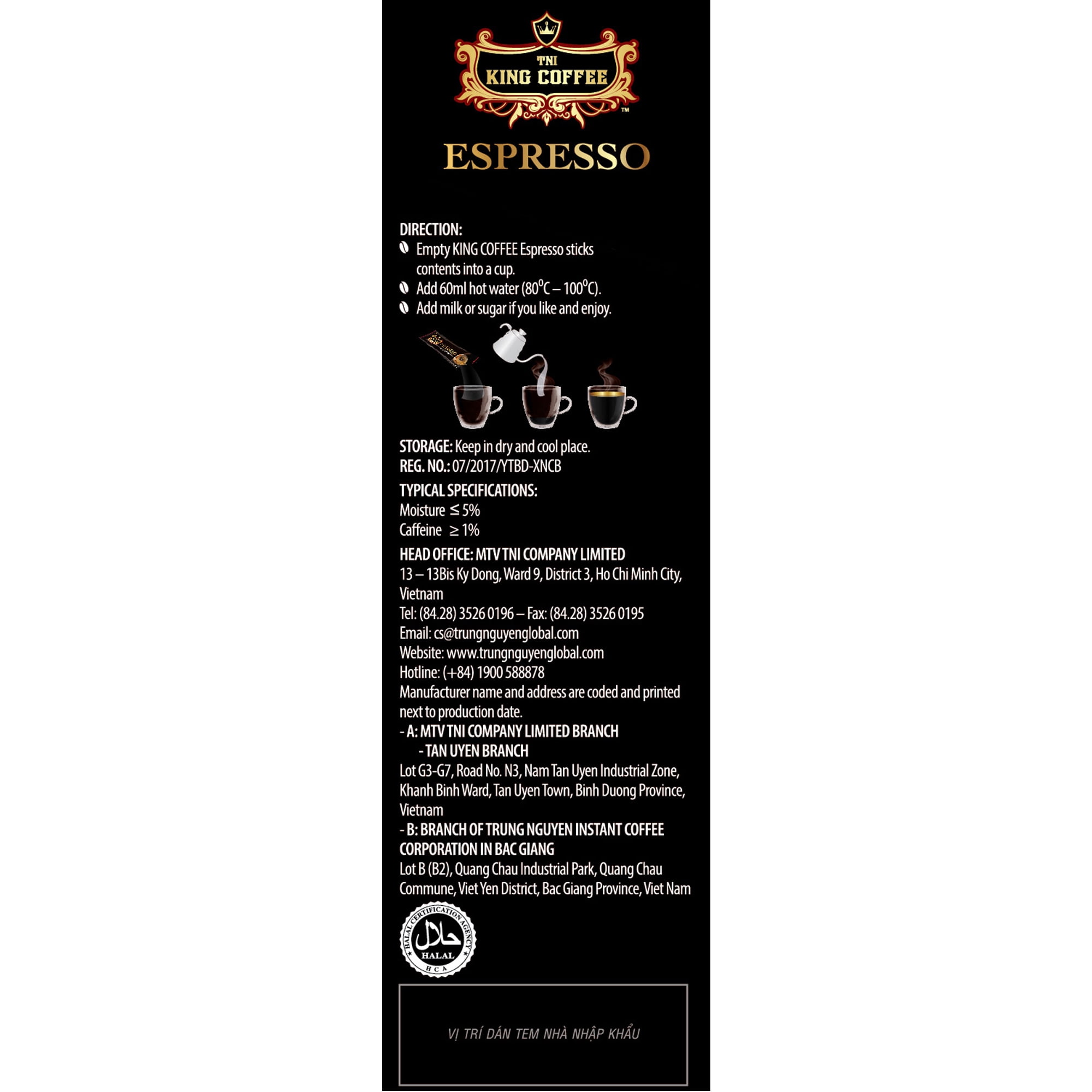 - KING COFFEE ESPRESSO INSTANT COFFEE: Each sachet (2.5g) is filled with Soluble Arabica coffee. Perfect for your own choice.