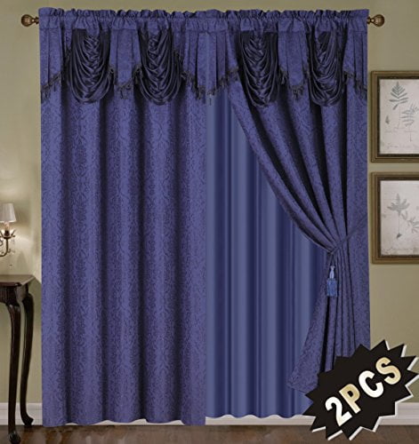 Luxury Embroidered Curtain Set. 4 Piece Navy Drapes with Backing & Valance & Tie Backs