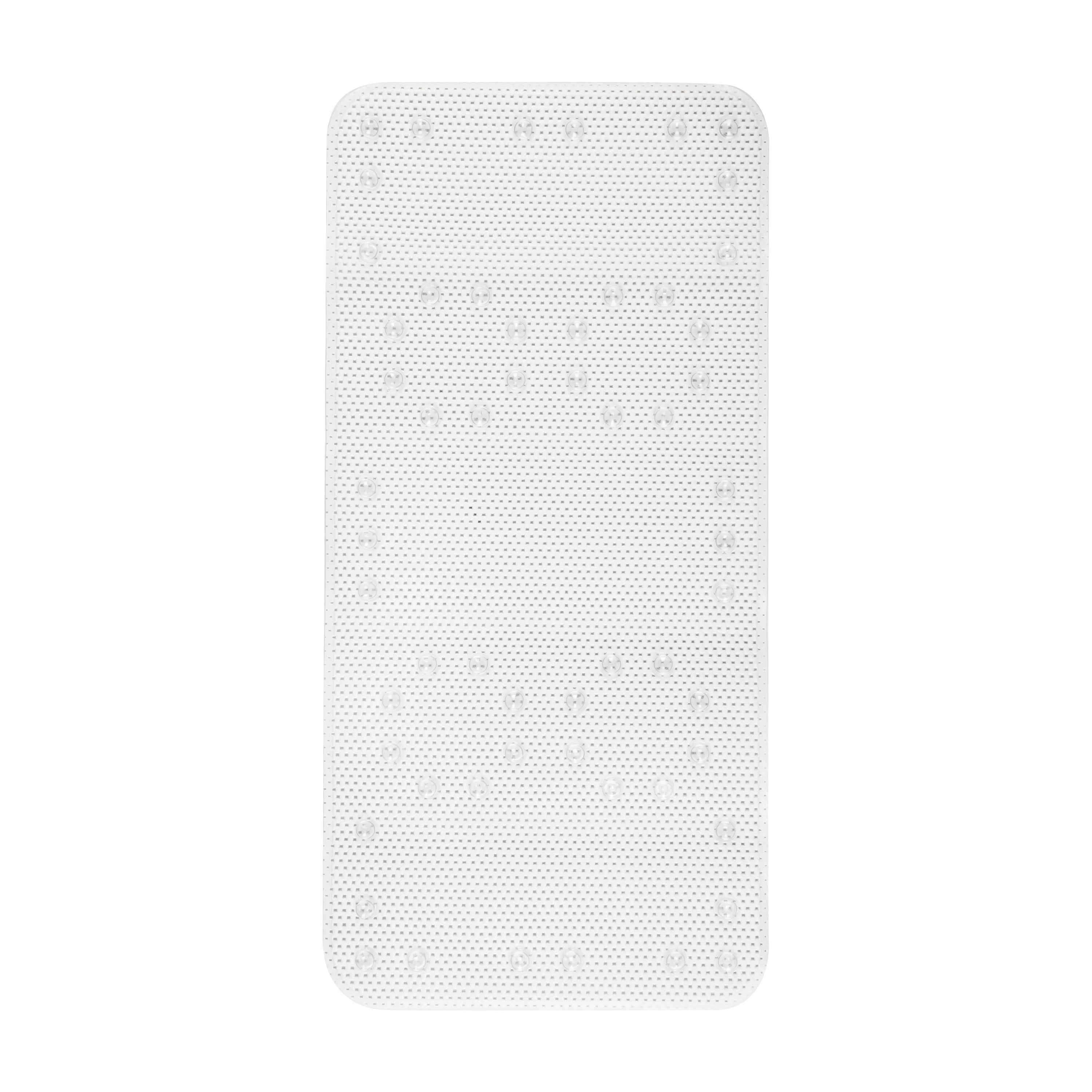 Whether you want comfort or safety for the shower or bath, Mainstays Bath Mats offer both in a simple and clean design. Featuring a simple waffle weave, this soft cushioned shower mat is sure to keep you safe and comfy thanks to its slip-resistant, suction cup design. Plus, this bath mat is machine washable (delicate cycle) for easy care. This bath mat is not to be used on textured, tiled or non-smooth surfaces. One bath mat is 17 inches x 36 inches. Add some comfort and safety to your bathtub and shop Mainstays 17 in. x 36 in. White Cushioned Bathtub Mat today!