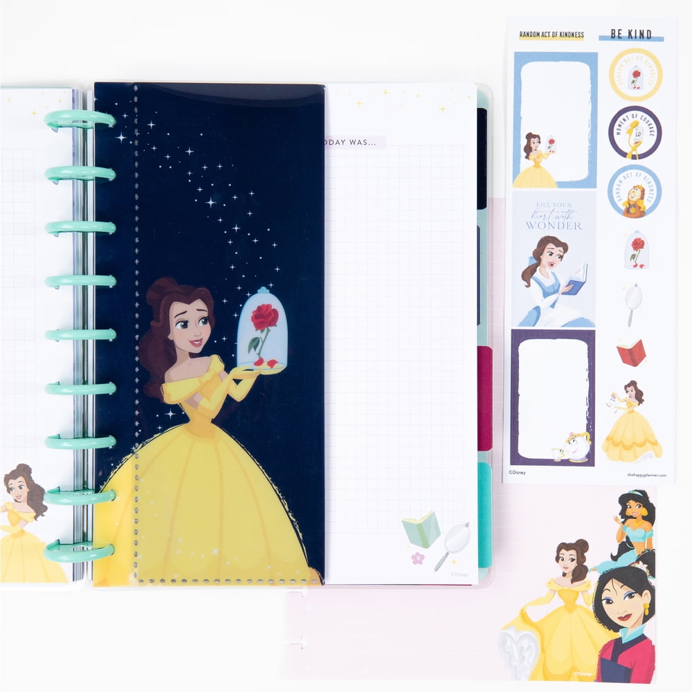 Trust In The Magic Guided Journal Box Kit features Disney Princesses Mulan, Jasmine, and Belle on the cover. This Classic size kit includes the following pieces: 1 journal, 1 snap in bookmark, 40 stickers, 6 dividers, 10 additional sheets of double-sided note paper, and 1 plastic envelope. The journal is undated, allowing you to start journaling during any point in the year. If you skip a day, week, or month you can pick back up and continue your journaling without the worry of skipping dated pages. Guided prompts like "morning reflection" and "what am I enthusiastic about today?" as well as "where do I feel at peace" and "mental exercise that helped me today" start as a guide and allow the user to reflect upon the day and their physical and mental status. The Disney Princess designs are featured throughout each section as well as classic quotes and icons from Beauty and the Beast, Mulan, and Aladdin.