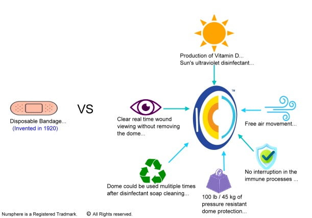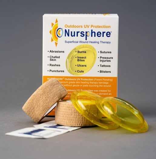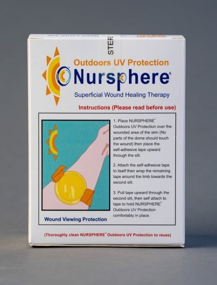 Nursphere Outdoors UV Protection (Patent Pending) is the first premium grade skin healing therapy bandage without gauze or padding touching the wound. Nursphere Outdoors UV Protection helps heal: Burns – Rashes – Cuts – Abrasions – Punctures – Ulcers – Sutures – Tattoos – Blisters – Warts Nursphere Outdoors UV Protection was created for individuals who spend more time outdoors and demand an extra layer of wound protection from UV sunlight. The clear plastic transparent dome covers; hard shell protects; allows viewing; allows ventilation; and providing Sun aided healing of superficial wounds. Nursphere Outdoors UV Protection is held by non skin adhesive breathable tape which adhere to the tape wrapping the limbs comfortably. Nursphere Outdoors UV Protection is recyclable and can be reused multiple times with limited impact on our environment vs disposable padded tapes. Contents: Two (2) Sterile Nursphere Outdoors UV Protection – Two (2) Self-adhesive tapes – Four (4) Alcohol wipesOur innovation allow wounds to be covered by a UV treated clear durable reusable plastic dome providing viewing, ventilation, and hard shell protection and sun-added healing.