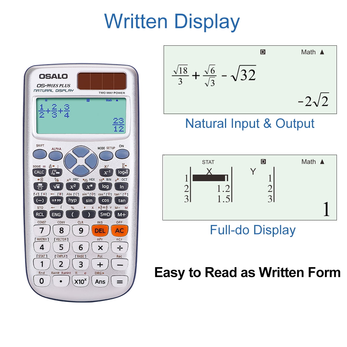 - 【Written Display Scientific Calculator】Input expressions and arithmetic operations same as written form in the textbook, which is more easy to read than traditional calculators. Written display expression same as textbook,convenient for students to check the calculation process and results.