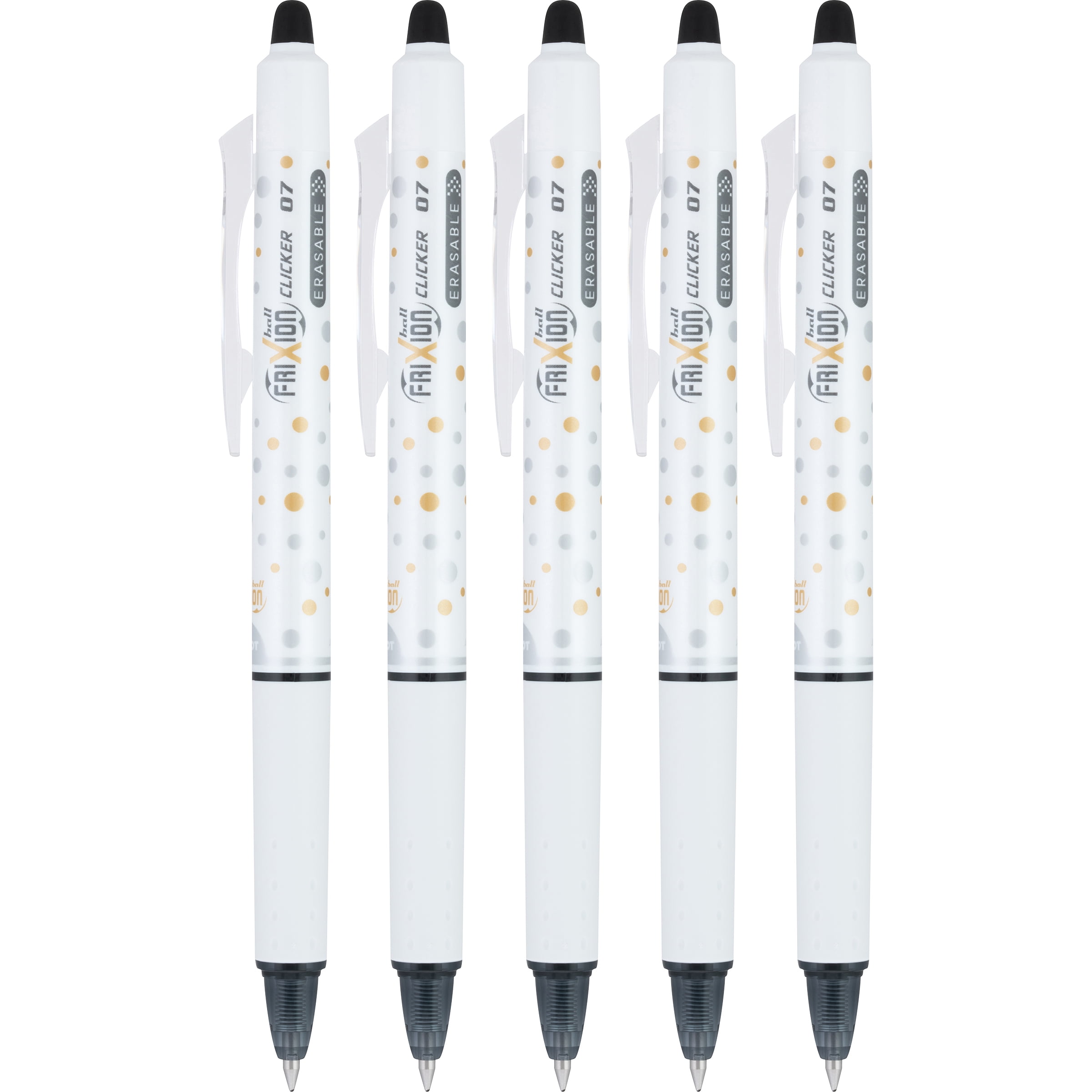 Never write a mistake again – guaranteed! Pilot FriXion Clicker is America’s first retractable, erasable gel ink pen that allows you to write, erase and rewrite repeatedly without damaging documents. FriXion’s unique thermo-sensitive ink is formulated to deliver both vibrant color and smooth writing. Pilot’s FriXion Clicker is refillable, and comes with a retractable clip and comfortable grip. Great for editing, lists, scheduling and so much more! Now your writing can be stress free and mistake free. Stylish white barrel with dotted design. Point size: 0.7 mm; Point Type: Fine; Ink Color(s): Black; Pen Type: Erasable Gel. 5 count.