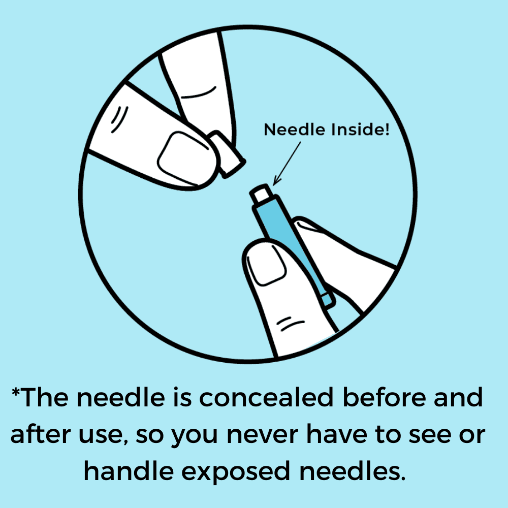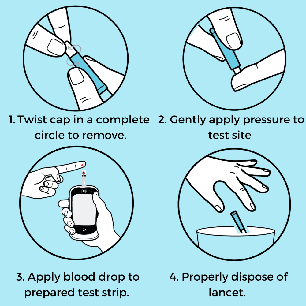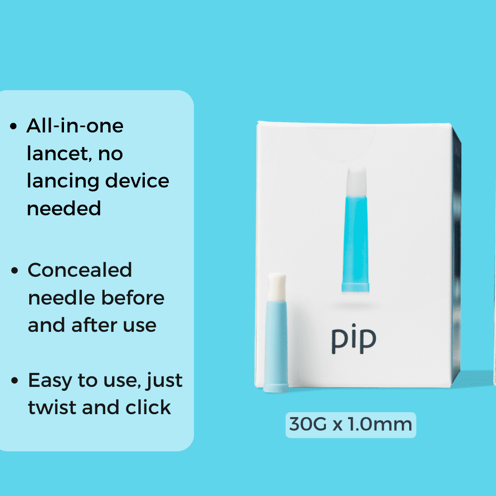 Pip Lancets are a simple, safe, and painless way for people with diabetes to check blood sugar.Pip Lancets provide a simpler way to test your blood-sugar. Each device is pre-loaded. Simply twist-off the cap and apply pressure. Device will activate gently against your fingertip to provide just the right amount of blood. No loading, unloading, depth setting or any other cumbersome aspects of traditional lancets and devices. Needle is concealed before and after use. Using Pip eliminates the need to handle exposed needles which makes Pip the perfect choice for individuals with poor dexterity, children, or anyone that wants to eliminate the risk of being accidentally stuck by a needle. Pip Lancets are available in 3 different sizes – choose the size you need based on your skin type.