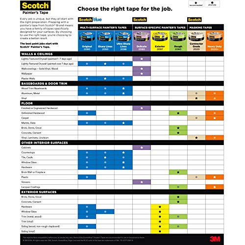Scotch Sharp Lines Painter?s Tape features Edge Lock Technology that seals out paint to deliver sharp paint lines. Whether you?re protecting your wood trim, painted walls, tile floor, or glass windows, this versatile multi surface tape can stay on surfaces for up to 21 days and then removes easily without leaving any sticky residue behind. Help keep your wainscoting paint free or shield your built in shelves with the powerful protection of Scotch Painter’s Tape Sharp Lines Painter’s Tape.