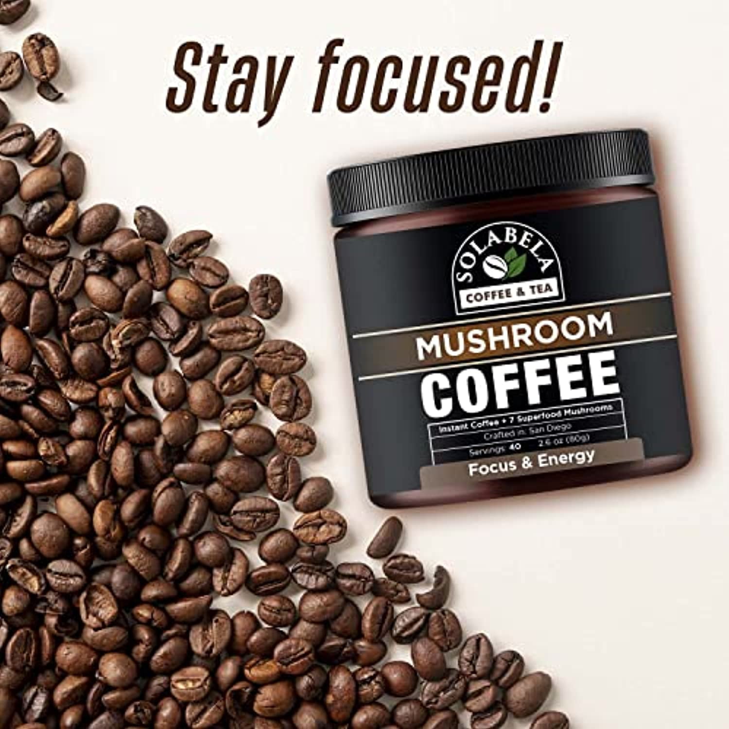 Solabela Coffee Organic Mushroom Coffee (40 Servings) with 7 Superfood Mushrooms, Great Tasting Arabica Instant Coffee, Includes Lions Mane, Reishi, Chaga, Cordyceps, Shitake, Mitake, and Turkey Tail