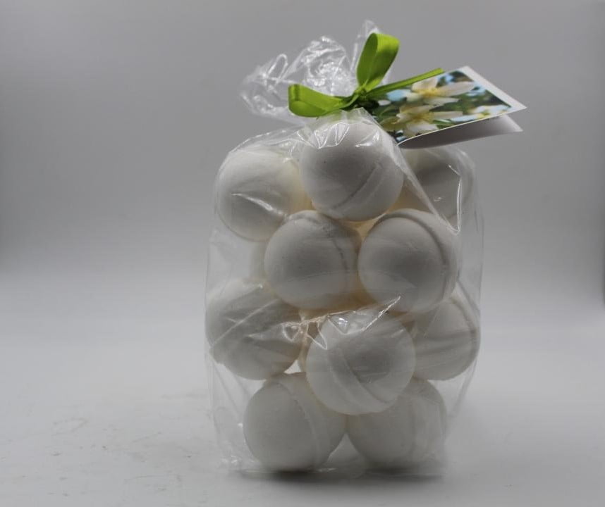14 Jasmine bath bombs, 1 oz each wrapped in a clear cello bag with coordinating hang tag and ribbon. Enjoy a relaxing bath as you soak. Spa Pure bath bombs are made with skin moisturizing ingredients including our 7-oil blend that moisturizes and replenishes your skin. Bathing with bath bombs is far better than lotion. The body oils will lock in the skin’s all-natural moisture while you soak, are 100% pure and natural ingredients, many oils are Kosher too. We work with over 100 best selling fragrances. Thank you for shopping with us.Natural, Handmade, Vegan