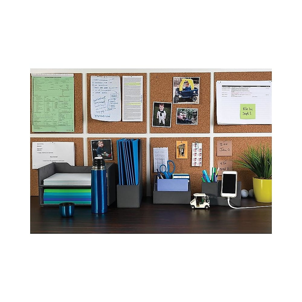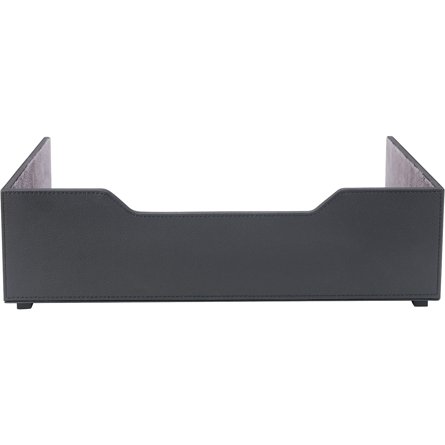 Store letter-size documents on your desk in this Quill Brand stackable black faux-leather letter tray.Organize important paperwork with this stackable letter tray. With a black faux-leather finish on the outside and soft gray suede lining the interior, this letter tray is durable for everyday use and looks attractive in a variety of spaces. Perfect for storing important paperwork, files, and other letter-size documents, this Quill Brand letter tray can be used alone or stacked on other similarly-sized trays for a customized organization solution. Save space around your desk with Side-loading letter trays. Black, leather-like exterior, lined with a soft gray suede that emulates professionalism. Dimensions: 4"H x 13"W x 9"D. Holds letter A size (8.5" x 11") documents and folders. If you’ve got a lot of papers, stack these letter trays high. Sold as 1 Each.