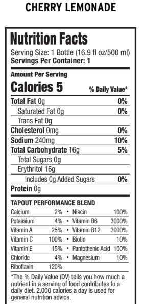 TapouT Cherry Lemonade Performance Drink is designed for active lifestyle men and women looking to enhance their workout performance. You push your body every day. Tapout is the first advanced performance drink that focuses on all three levels of physical support: activation, hydration and recovery. The TapouT Performance Blend contains 6 B-vitamins resulting in increased endurance and performance. Designed with NO artificial sugar, color or flavorings while delivering all 5 electrolytes for rapid hydration.