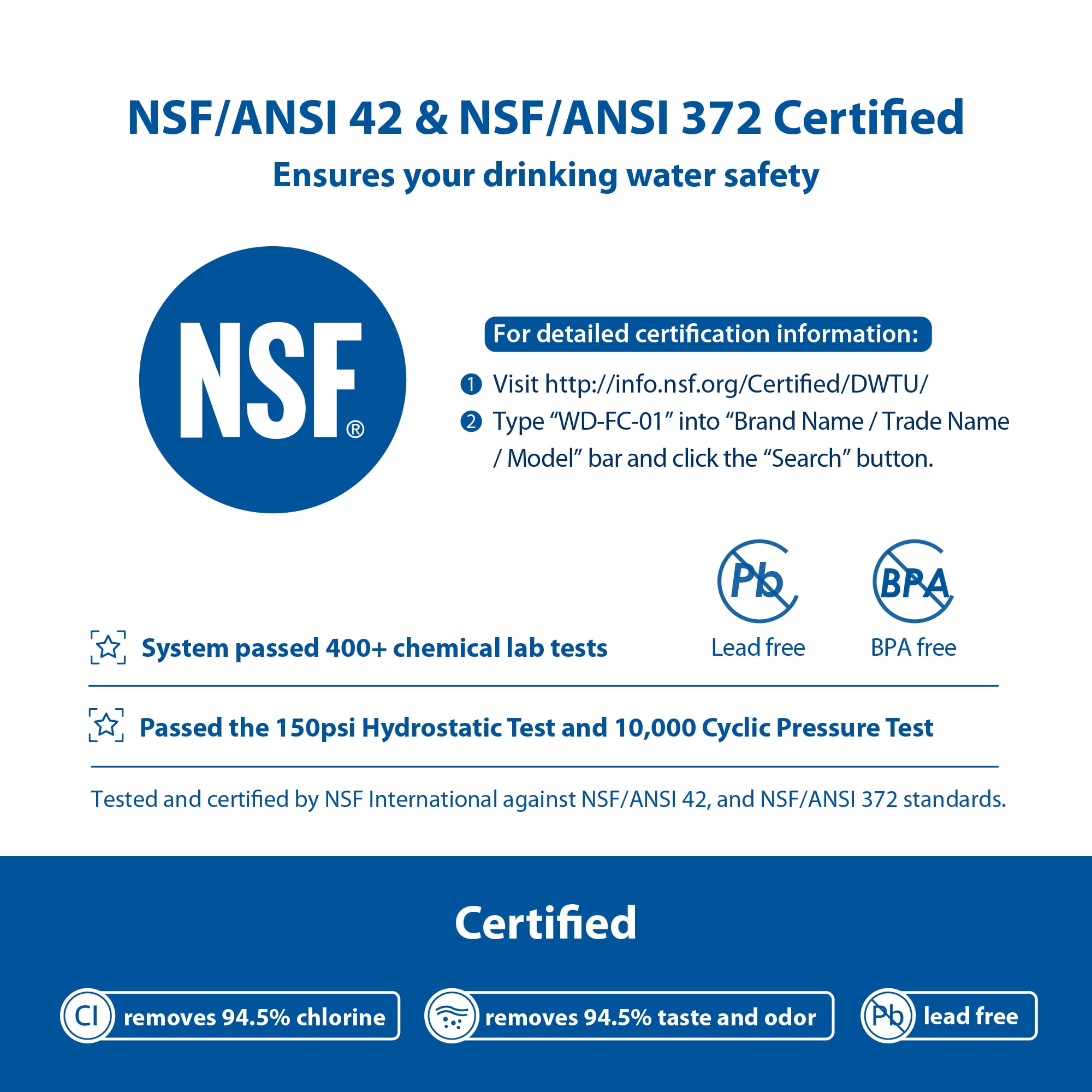 - NSF certifications: Tested and certified by NSF International against NSF/ANSI standard 42 for the reduction of 94.5% chlorine, taste and odor, and to NSF/ANSI 372 for lead-free material. Provides you with safer and healthier water.
