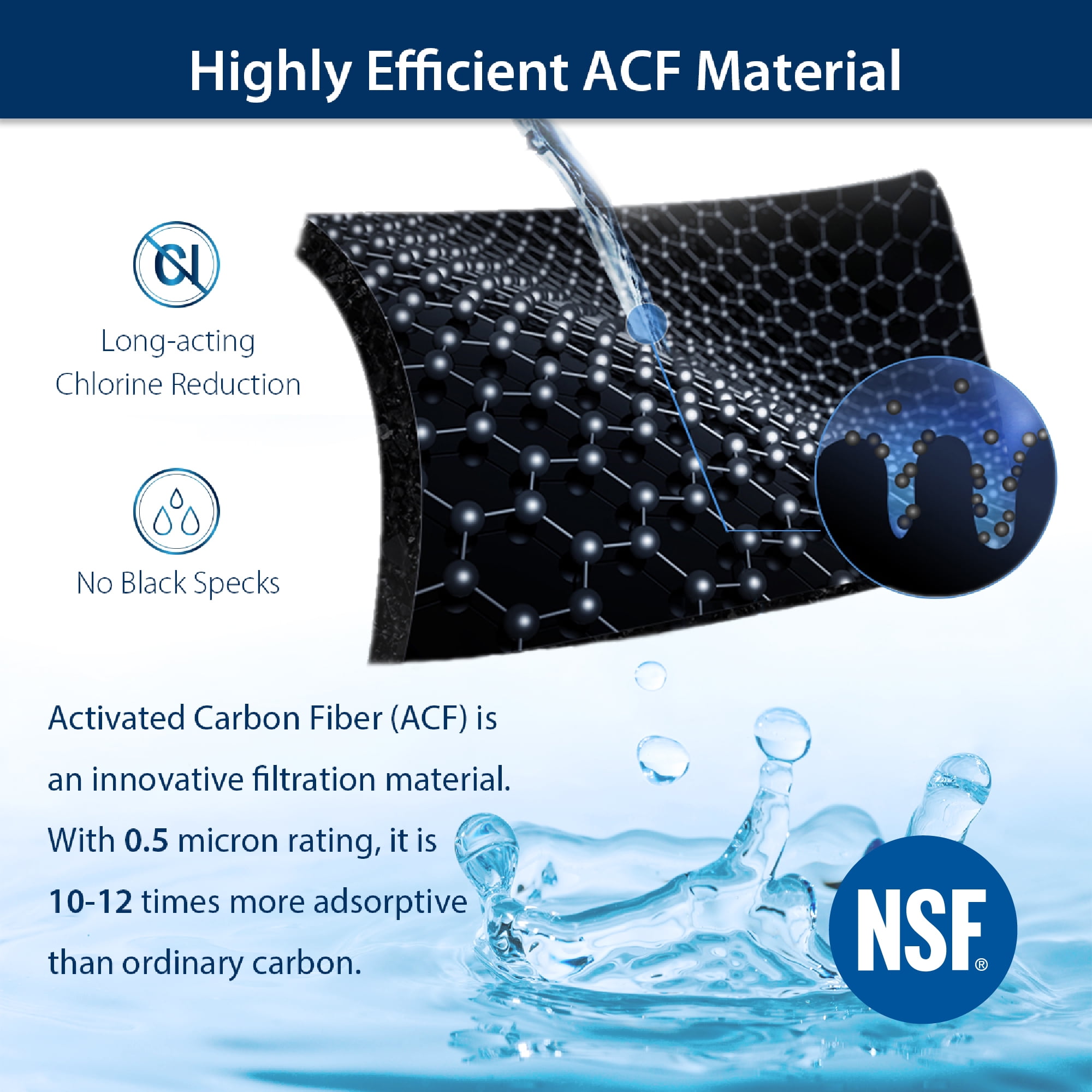 Upgraded filtration technology is newly adopted to reduce lead, fluoride and many more contaminants for highly efficient filtration, based on the 0.5 micron Activated Carbon Fiber (ACF).
