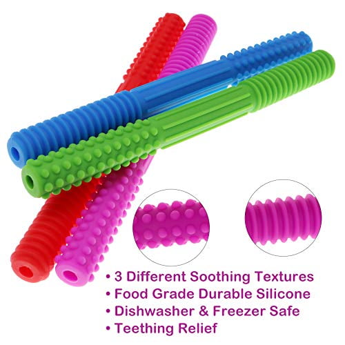 Munchewy Sensory Teething Tubes(4 Pack), Soft Silicone Hollow Teether Chew Toy for Babies, Toddlers, Kids, Boys, Girls with Autism, ADHD, SPD, Biting, Teething, Sensory Needs(Blue,Green,Purple,Red)