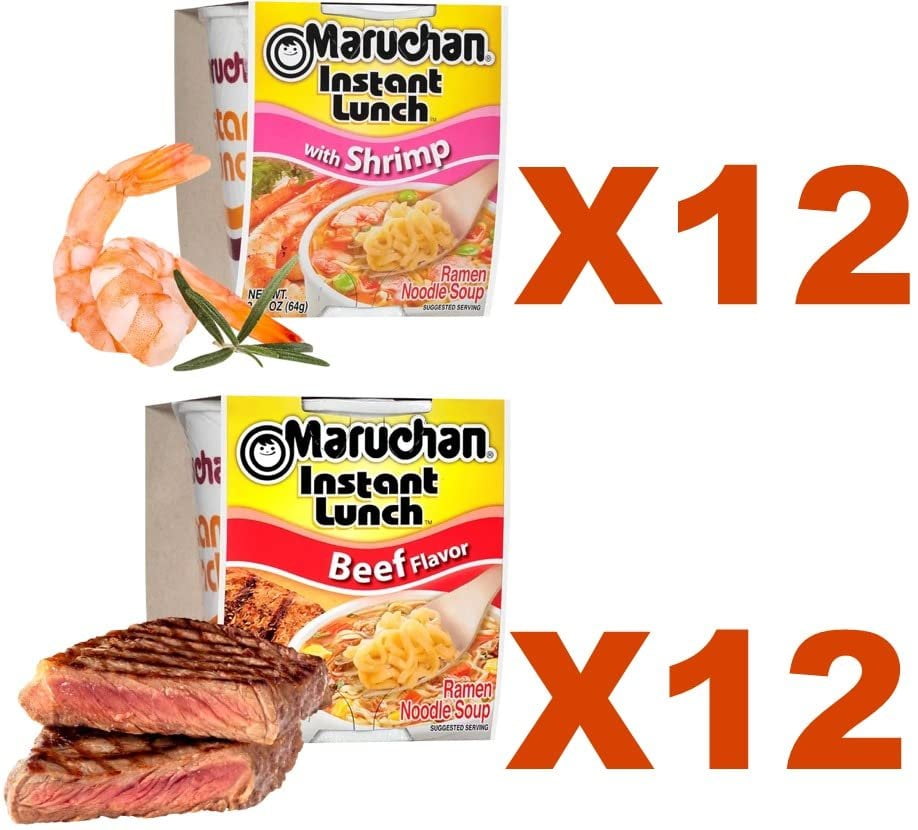 Maruchan Ramen Cup Noodles Instant 24 Count – 12 Beef cups & 12 Shrimp cups Lunch / Dinner Variety, 2 Flavors