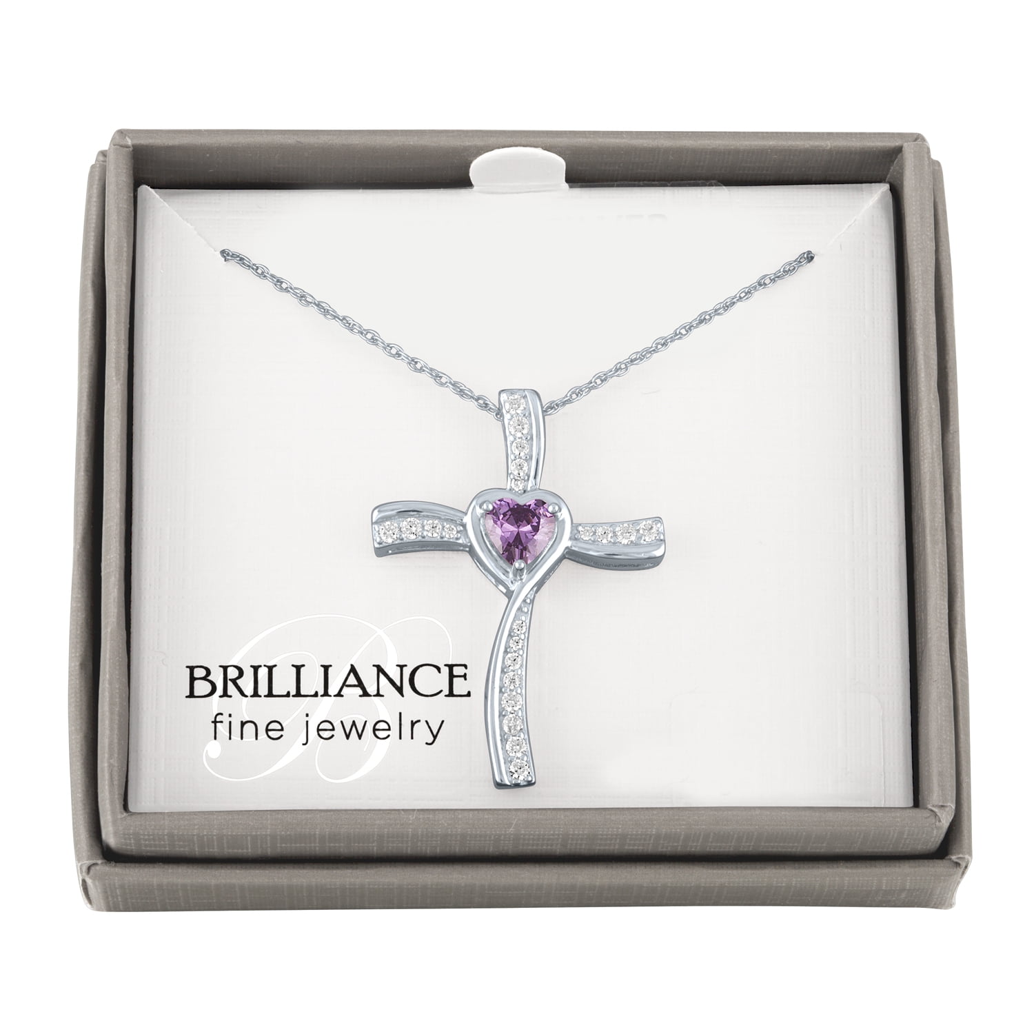 Brilliance Simulated Amethyst and CZ Sterling Silver Cross Pendant, 18′