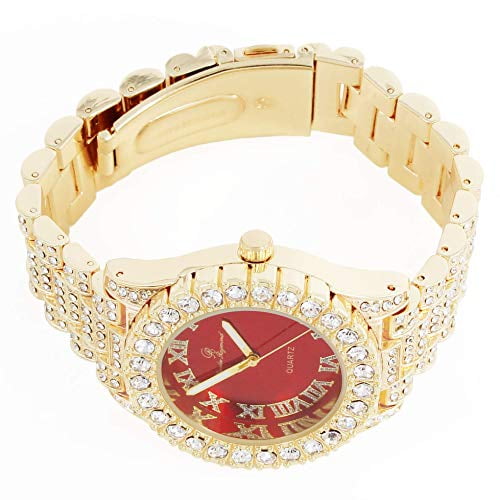 Charles Raymond blinged Out Mens Silver Big Rocks Hip Hop with Roman Numerals Fully Iced Out Colorful Dial Watch – ST10327 RN Single (Gold Blood Red)
