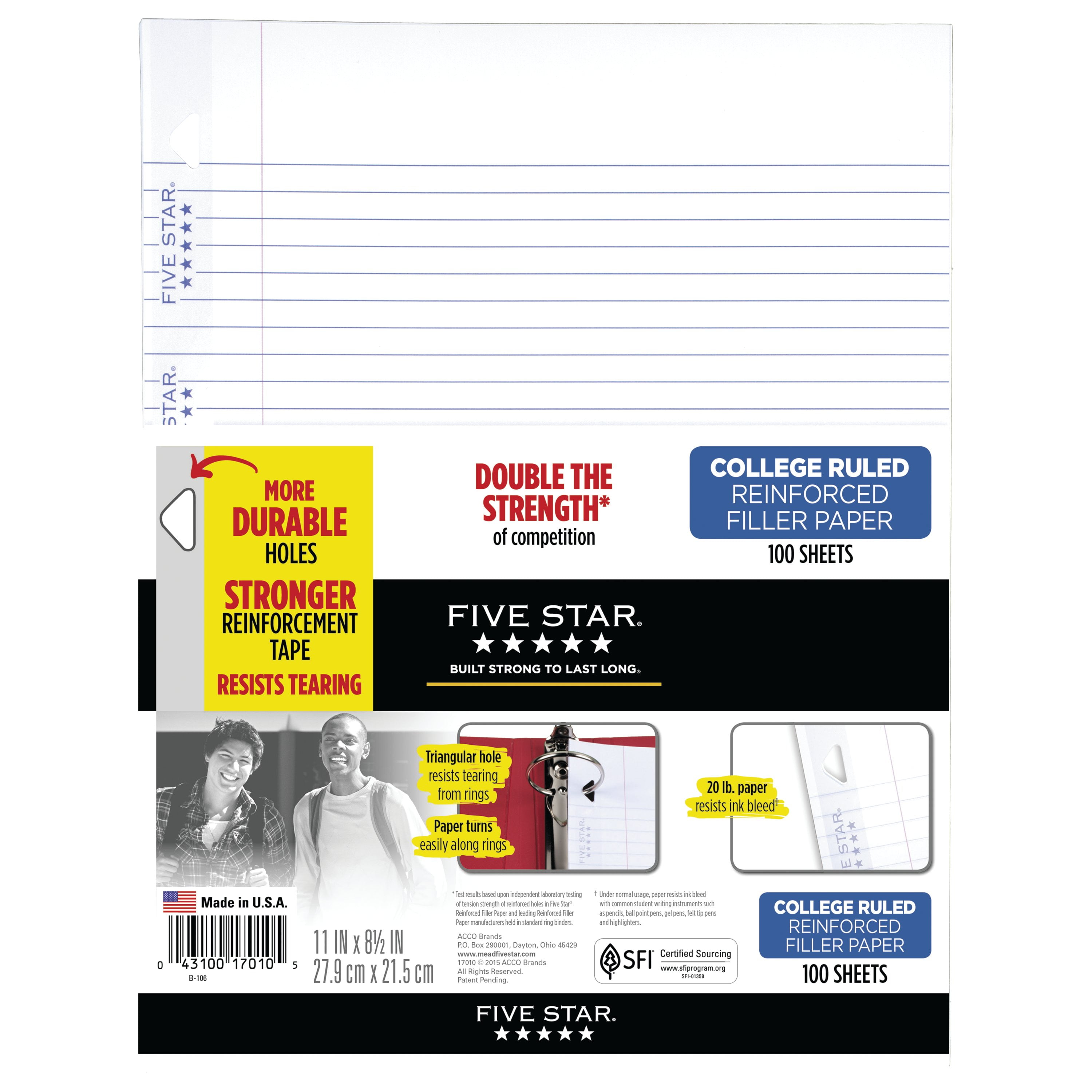 Five Star Reinforced Filler Paper, College Ruled, 11′ x 8 1/2′, 4 Pack (38032)