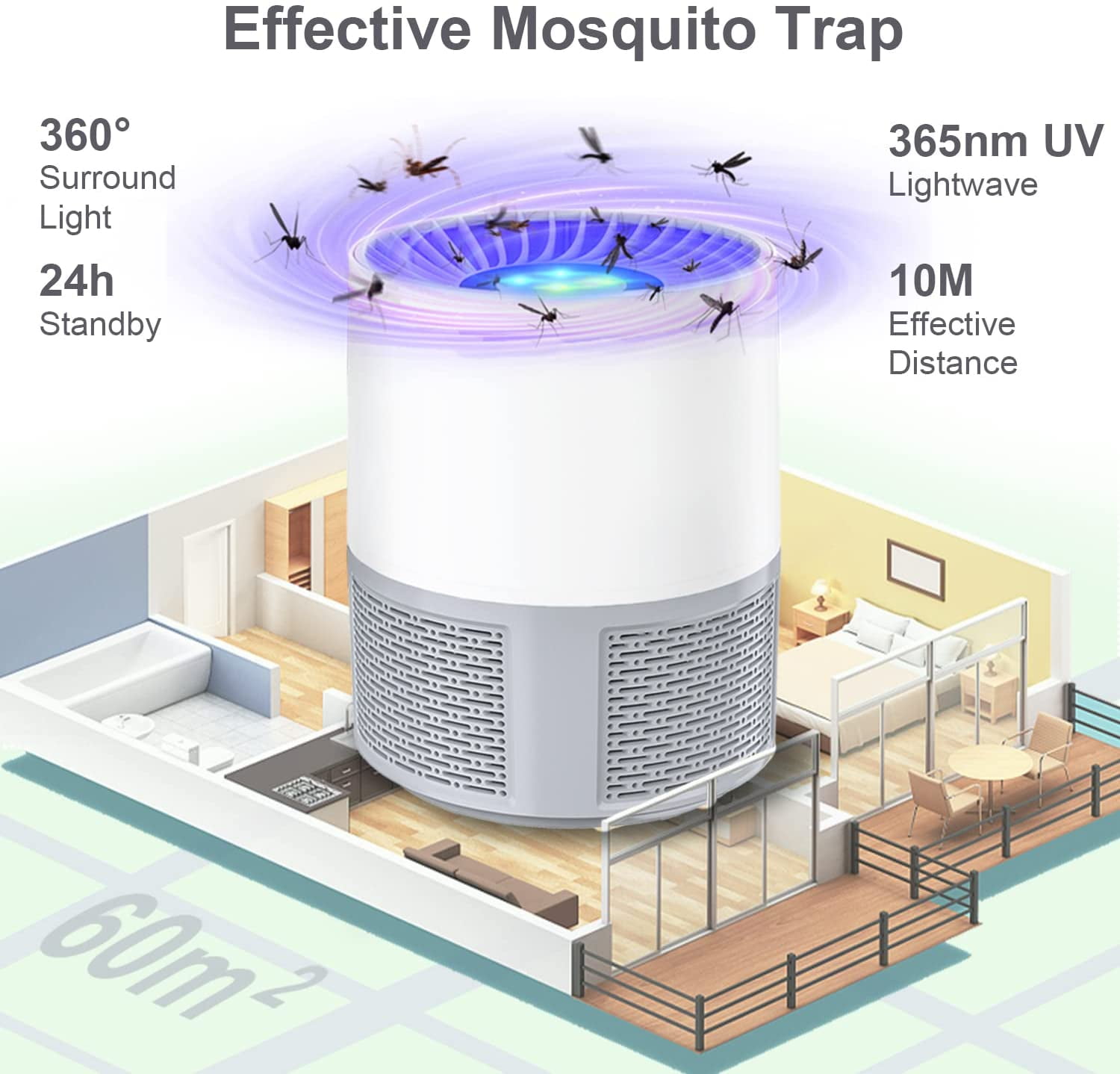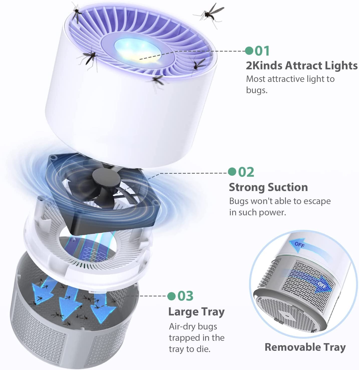 【Quiet and Simple】The insect trap works as long as powered in. No complex controling mode to waste time, the attracting work runs automatically. The fly traps for indoors quiet under 30db during runing, no zapper sound. For those who requires quiet for sleep or whoever have sleep problem, the insect trap is able to provide them quiet and no mosquito night.