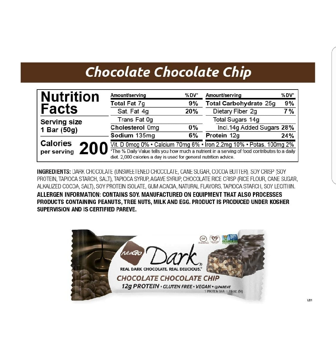 - Dark Chocolate (Unsweetened Chocolate, Cane Sugar, Cocoa Butter), Soy Crisp (Soy Protein, Tapioca Starch, Salt), Tapioca Syrup, Agave Syrup, Chocolate Rice Crisp (Rice Flour, Cane Sugar, Alkalized Cocoa, Salt), Soy Protein, Gum Acacia, Natural Flavors, Tapioca Starch, Soy Lecithin