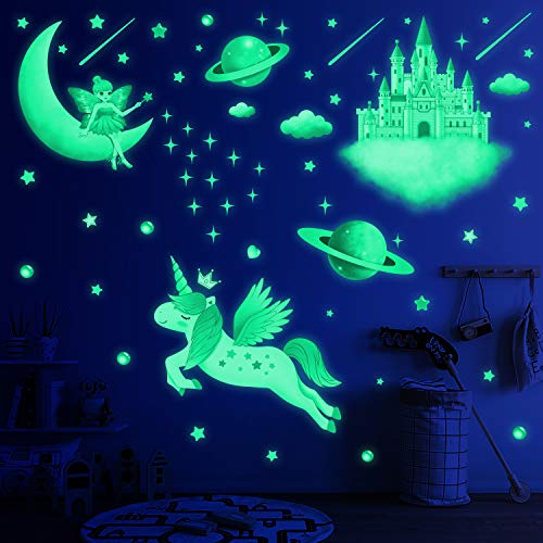 194 PCS Glow in The Dark Stars for Ceiling, Wall Decals for Girls Bedroom, Unicorn Room Decor for Girls Bedroom, Moon Castle Butterfly Fairy Planet Wall Stickers for Kids, Birthday Gift for Kids
