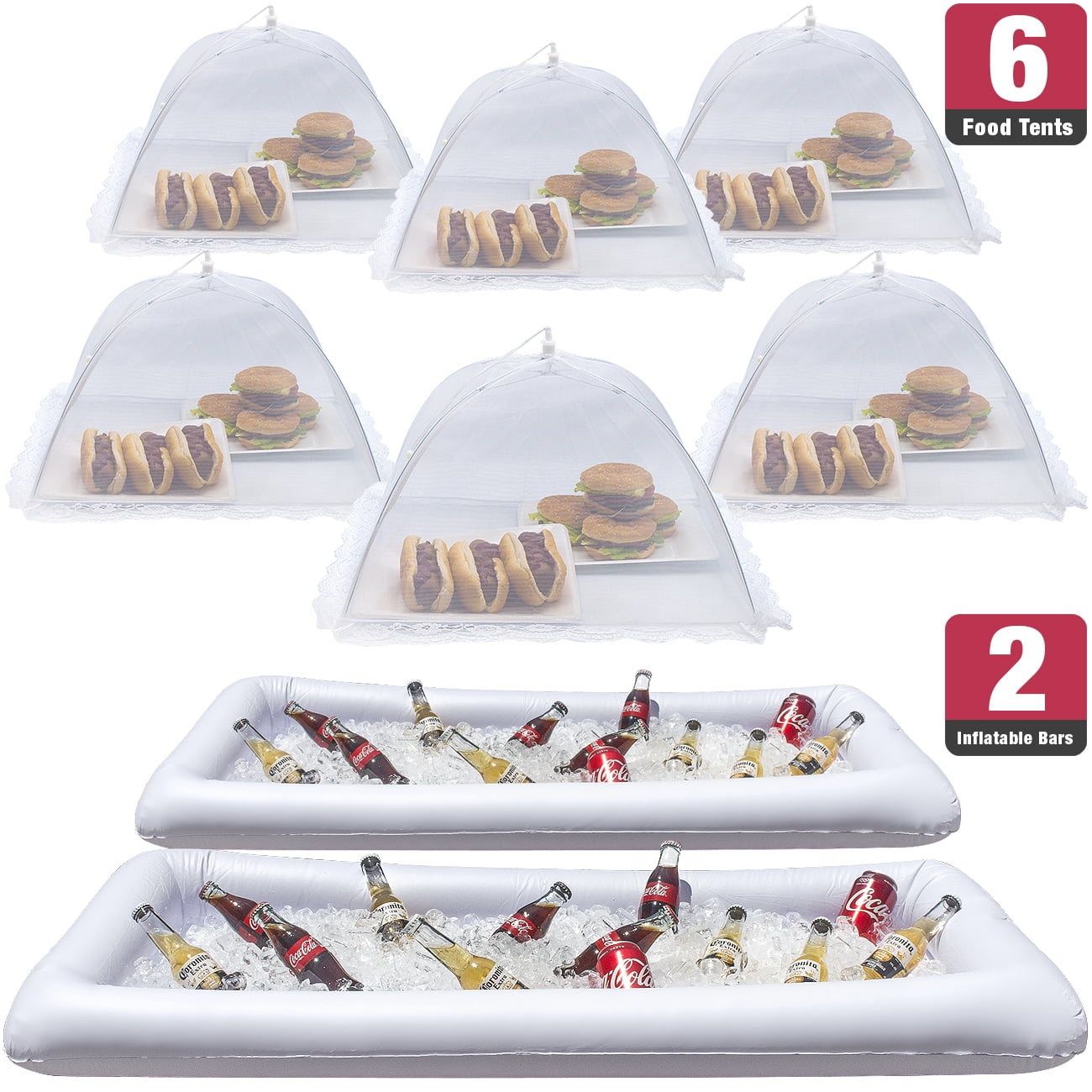 - LARGE CAPACITY DESIGN — Extra large for multiple serving bowls and food items — Deflates for compact storage — Package Includes 2 Inflatable Serving Bars, 6 Nylon Mesh Food Cover Tents (Color: White) — Easy to clean with damp cloth — Approximate Measurements: Inflated Serving bar 49" L X 23.75" W X 4" H — Umbrella cover 16.25" L X 11.50" H — Waterproof