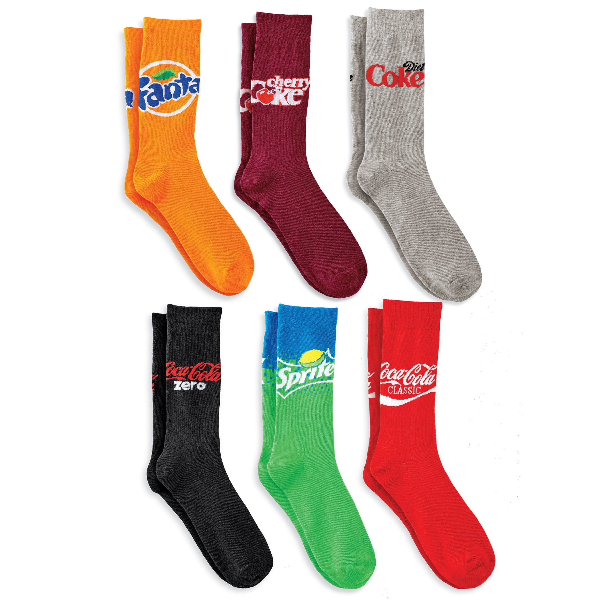 Packaged in a colorful vending machine style box, this fun collection includes 6 pairs of Coca-Cola® brand socks! Your favorite soft drinks are featured including Coca-Cola®, Coke Zero®, Cherry Coke®, Diet Coke®, Fanta® and Sprite®. The comfortable, calf-length socks are polyester and spandex. Machine wash. One size fits most shoe sizes 6 1/2-12. Unisex. Imported.