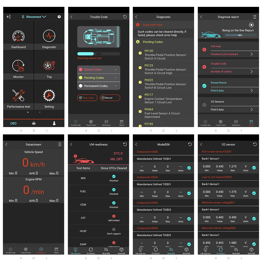 - The scanner support to read and reset check engine light, I/M Readiness, Battery Health Check, Freeze frame, O2 sensor test, On-Board Monitoring, Evap system test, Performance Test, Data Stream, and Diagnostic reports.