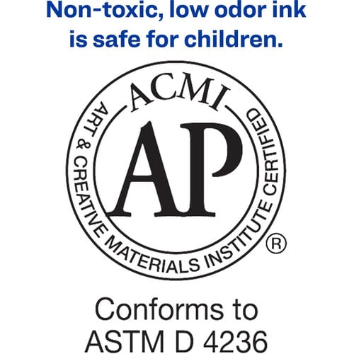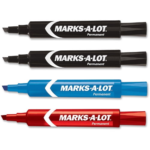 Make your mark on the world with this set of Avery Marks-A-Lot assorted markers. Choose from 4 chisel tip markers including 2 black markers, 1 red marker and 1 blue marker. The resilient chisel tip stays solid even with frequent use and is great for creating various different line widths. The versatile, permanent marker ink dries quickly when used but won’t dry out if you forget the cap. Leave the cap off for up to half an hour and you will still be able to pick the marker back up and keep writing. The permanent ink resists wear and water exposure and is perfect for any use. These markers work with multiple surfaces including paper, cardboard, metal, PVC, concrete, plastic and ceramic. Write on sports equipment, make signs for yard sales, mark boxes and more. Marks-A-Lot chisel tip markers are great everywhere from classrooms and offices to warehouses and manufacturing facilities. Avery Marks-A-Lot permanent markers are also low-odor and nontoxic so that they can be safe in classrooms as well as in laboratories. The ink is ACMI certified as nontoxic and conforms to ASTM D4236. More from the Manufacturer