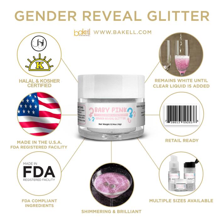 Having a boy or girl? Unveil your newest family member with some sparkle using our NEW Gender Reveal Edible Drink Glitter. Perfect for a wide variety of gender reveal party guests, this Kosher & Halal Certified beverage glitter remains White until clear liquid of your choice is added revealing a beautiful Baby Blue or Pink color.Having a boy or girl? Unveil your newest family member with some sparkle using our NEW Gender Reveal Edible Drink Glitter. Perfect for a wide variety of gender reveal party guests, this Kosher & Halal Certified beverage glitter remains White until clear liquid of your choice is added revealing a bea