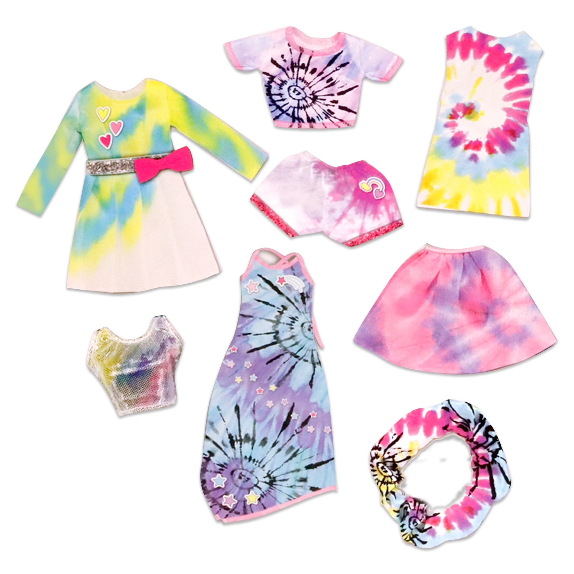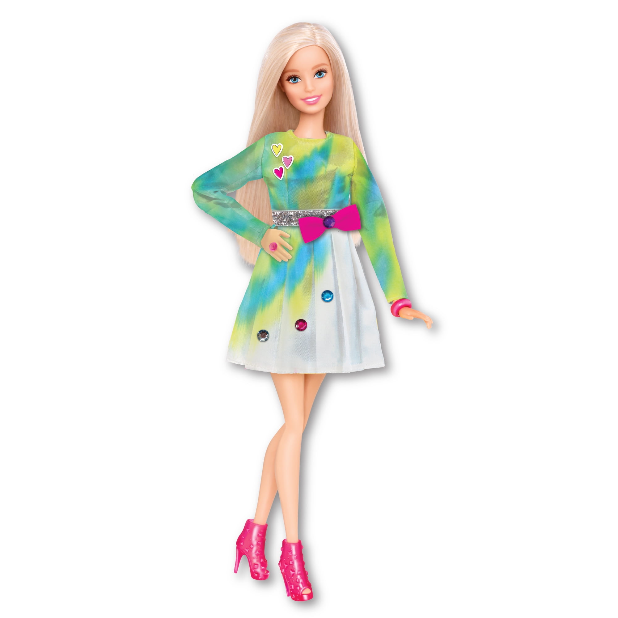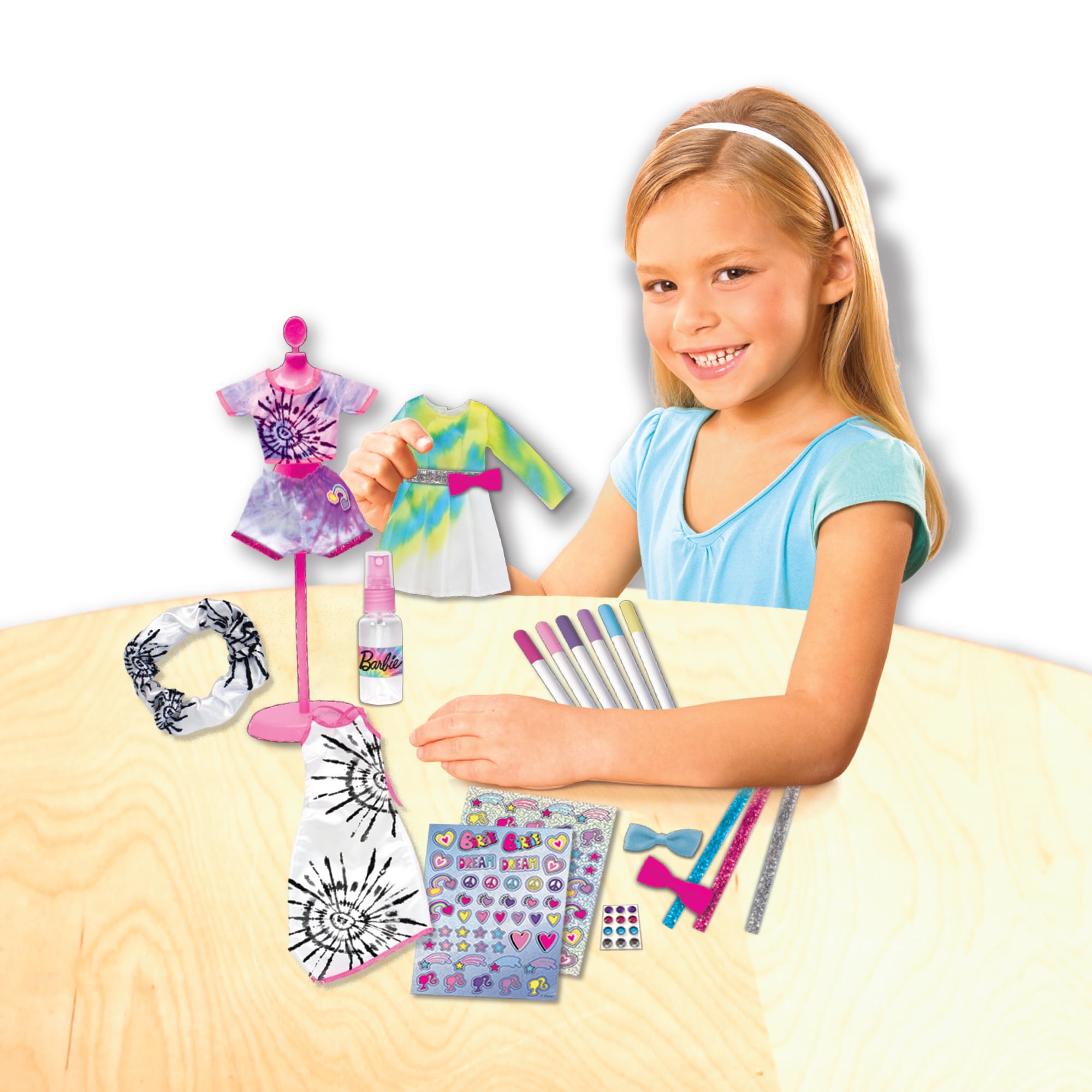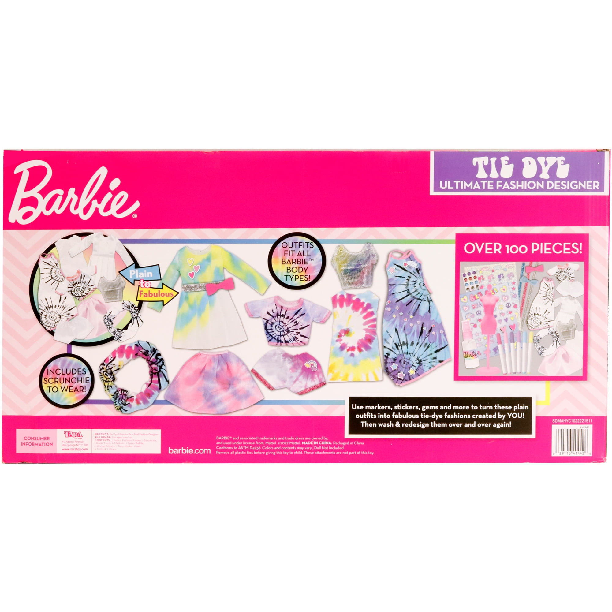 You’re the designer! Create your own tie-dye fashion design looks with no mess! Just color and blend with water. Display your fashion pieces on the dress stand. Add sticker and fabric embellishments to complete the look! Also includes a scrunchie for you to design and wear. Hours of creative fun for you and your friends. Design and dress your Barbie’s in your own fashions. The Barbie Tie Dye Ultimate Fashion Doll Designer Playset includes 7 fabric fashion pieces, 1 scrunchie, 1 dress form, 6 markers, 1 spray bottle, 2 sticker sheets, 1 gem sticker sheet, 3 trims, 2 bows