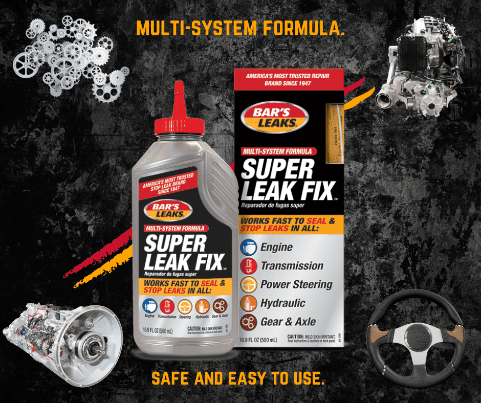 Bar’s Leaks Super Leak Fix is formulated to work in multiple systems including all Engine Oil, Transmission, Power Steering, Hydraulic and Differential & Gear. Use to stop current leaks, or as a preventative maintenance before leaks start. Premium seal renewing additives are designed to stop seal and gasket leaks caused by normal wear and age. Contains no solids, will not clog filter or harm system.