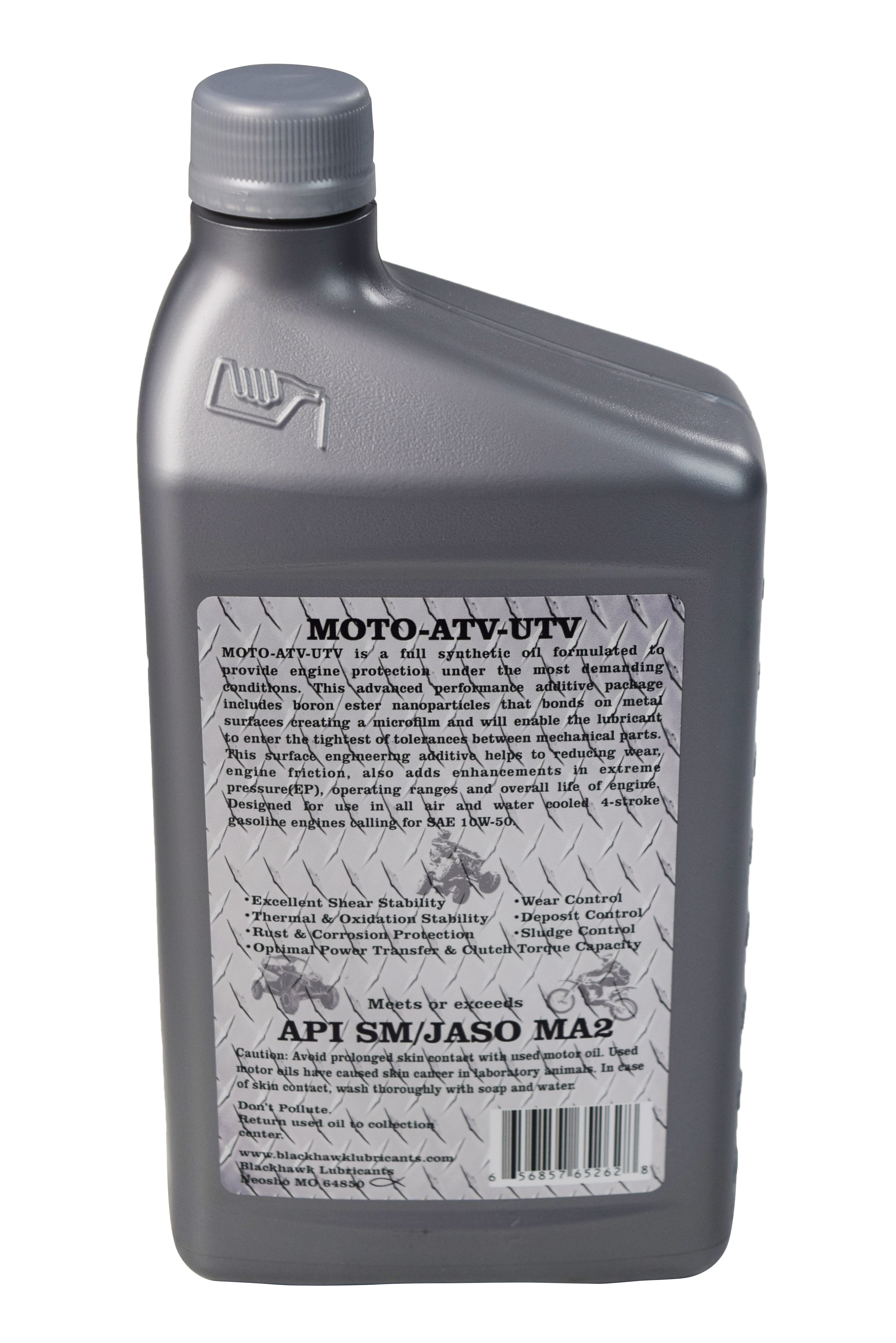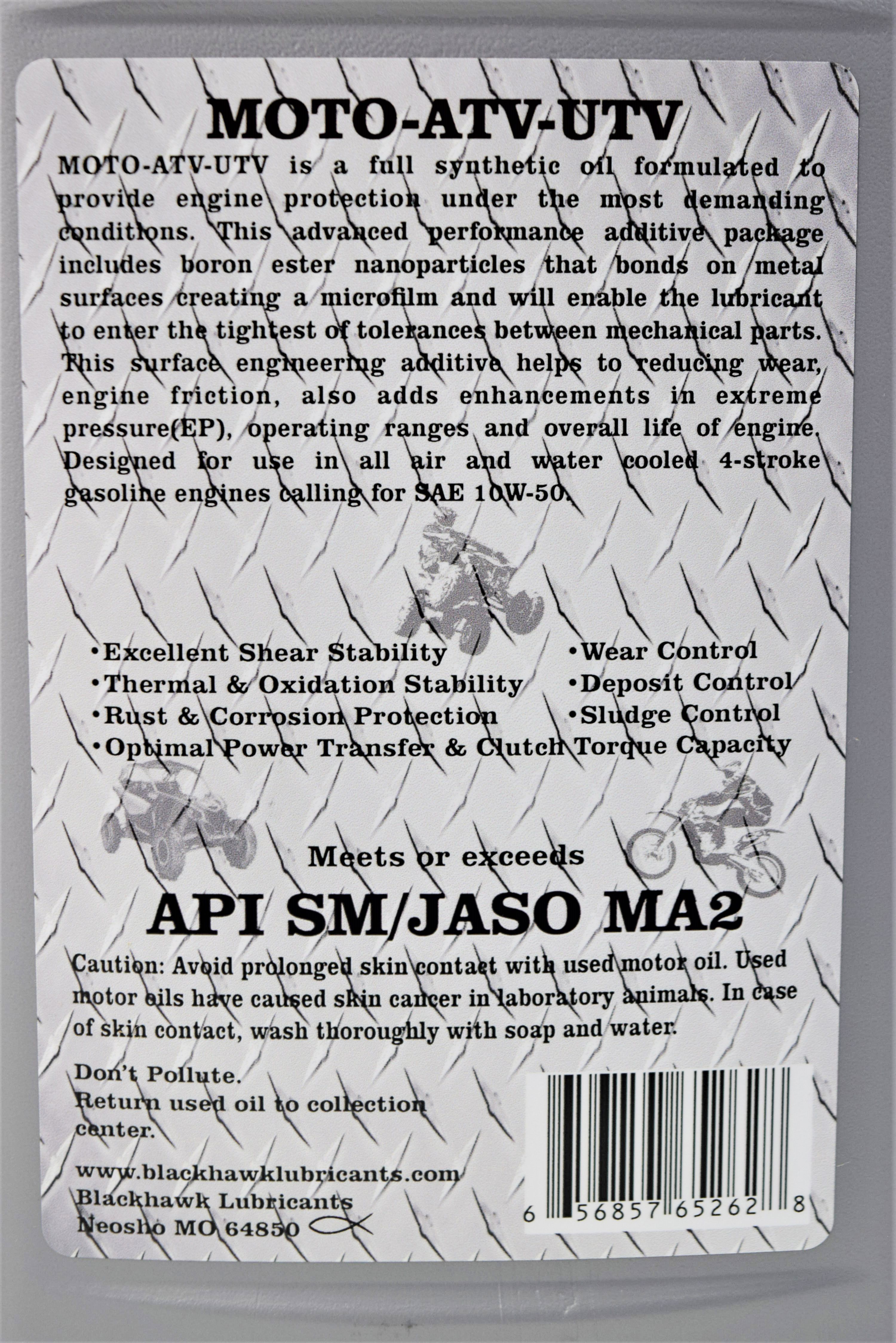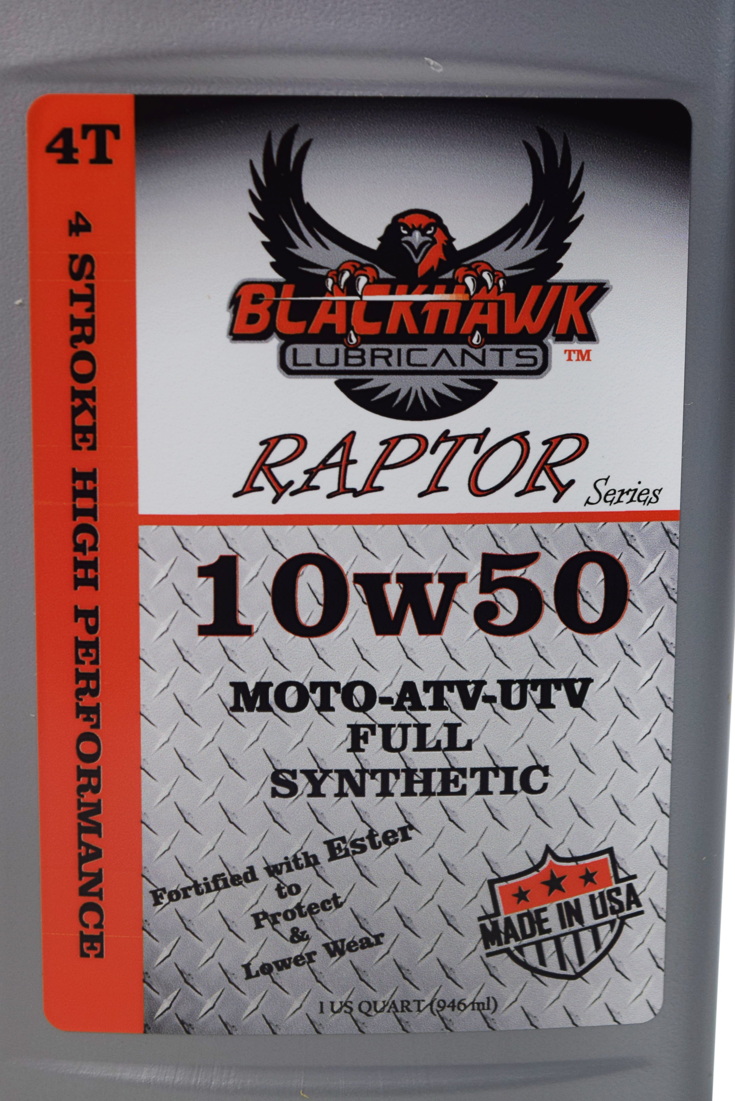 Blackhawk Lubricants Raptor Series 4T 4 stroke high performance Moto/ATV/UTV is built to keep your engine going the extra mile. This 10W50 oil is a full synthetic that’s fortified with ester to increase protection and lower wear on components. It was designed to hold up under the most demanding conditions. Why? Because the last place you want your oil to fail you is when the stakes are high. It uses boron ester nanoparticles that bonds on metal surfaces that create a microfilm and enables it to enter extremely tight tolerances. In simple terms, the high tech features of this oil allow it to create a film on metal and reach every little nook and cranny for ultimate lubrication. All of this helps reduce wear, engine friction, adds enhancements in extreme pressure, operating ranges, and boosts the overall life of the engine. It meets or exceeds API SM/JASO MA2 standards. And the best part? It’s made in the USA!Blackhawk Lubricants Raptor 4T 10W50 Ester Full Synthetic Engine Oil 1 qt 2 Pack