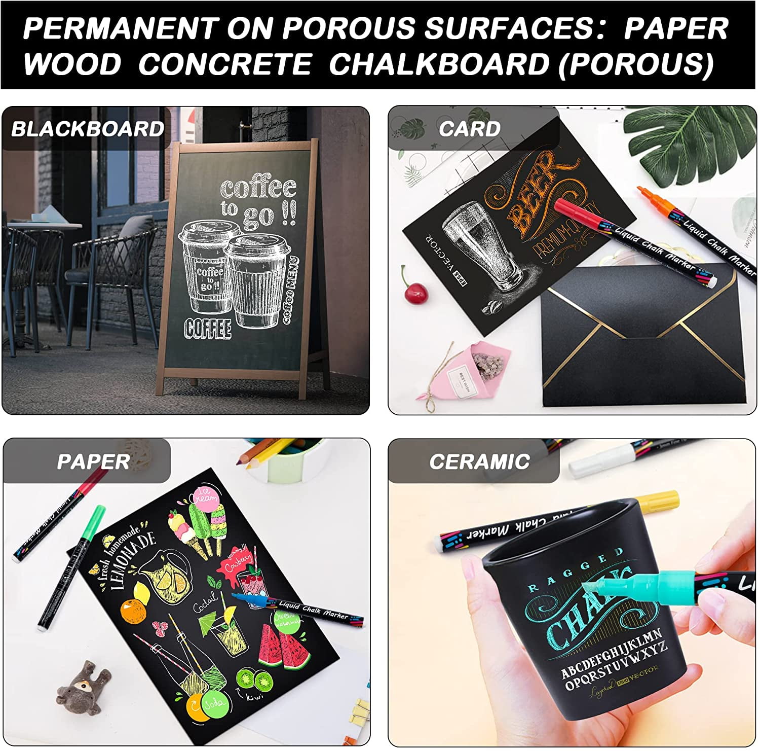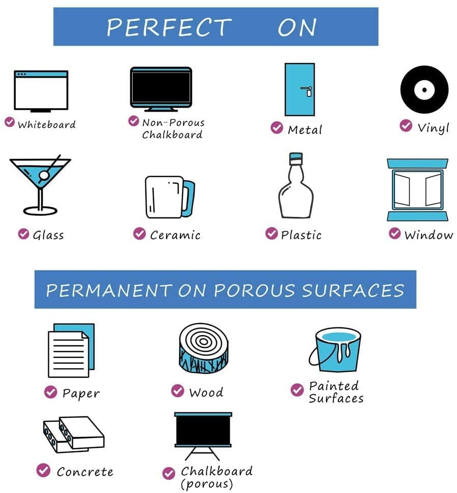 - COMES OFF EASY: The chalkboard pen will work on almost any surface. When you’re ready to write & start fresh, a mere wipe of a wet paper towel will remove your erasable chalk markers completely and easily from almost any NON-POROUS surface. Please notice that the ink is PERMANENT on POROUS surfaces.