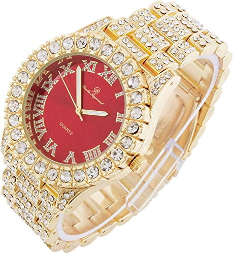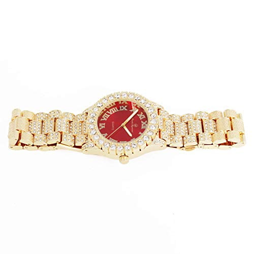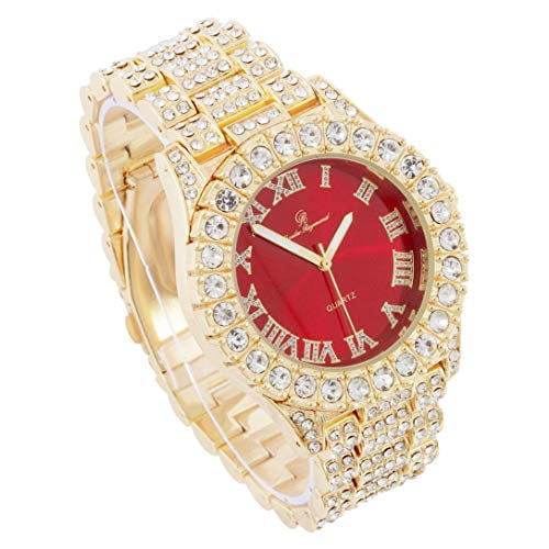 Charles Raymond blinged Out Mens Silver Big Rocks Hip Hop with Roman Numerals Fully Iced Out Colorful Dial Watch – ST10327 RN Single (Gold Blood Red)