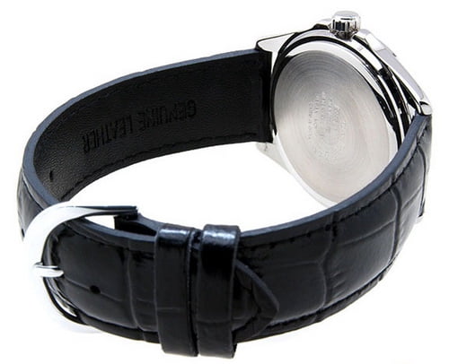 Simple and easy to use design, this Casio men’s watch features a round white dial with luminous hands and hour markers, day window at 12 o’clock and date at 6 o’clock position. All of these are framed in a stainless steel case, push crown and protected by mineral crystal. It also offers a black leather strap secured with buckle closure, Japan quartz movement and water resistance up to 50 meters/165 feet.