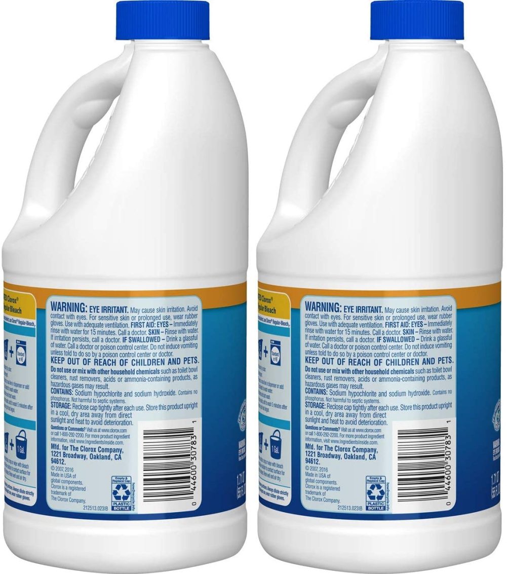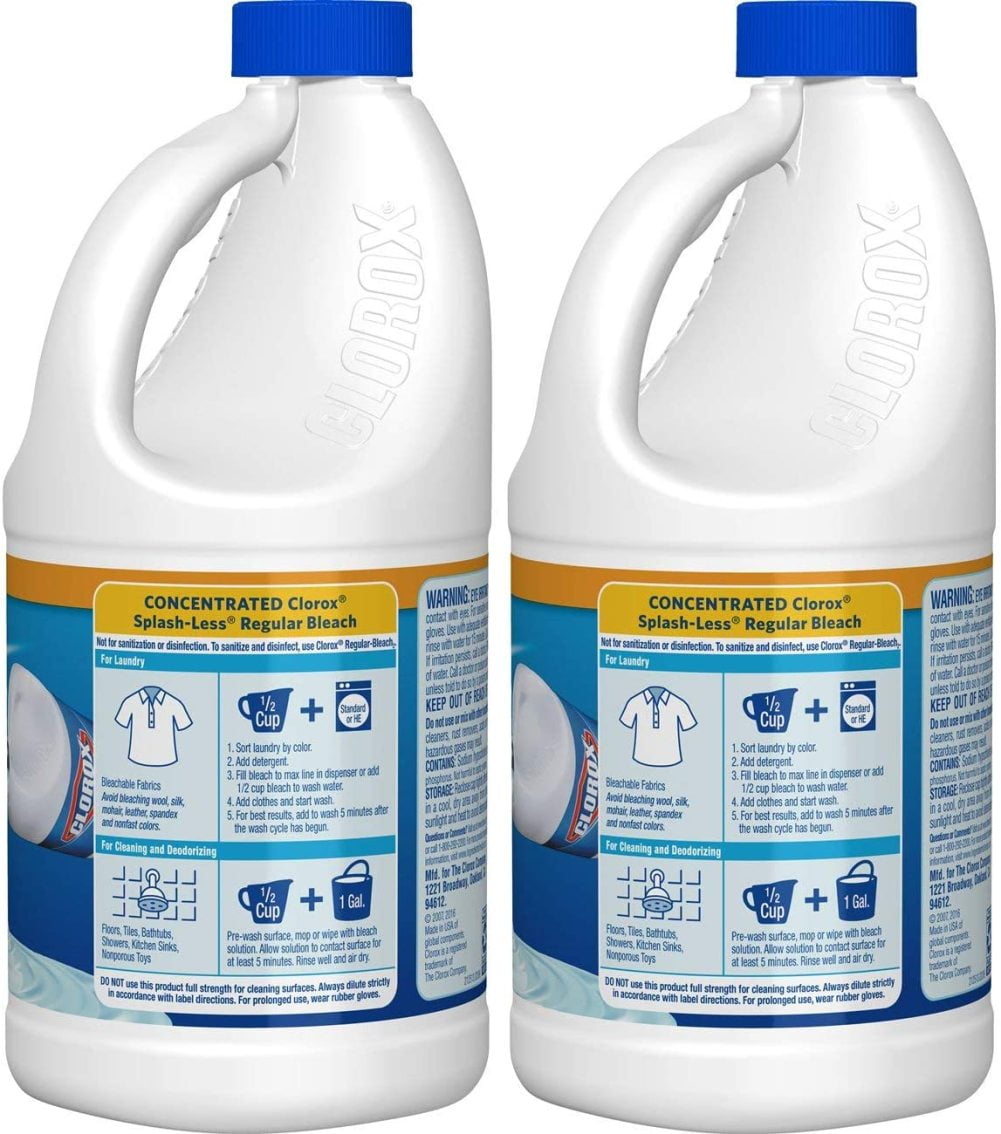 - Pack of two 55 ounce bottles of Clorox Splash less Regular Liquid Bleach with caps that are sealed to ensure leak free delivery to your door